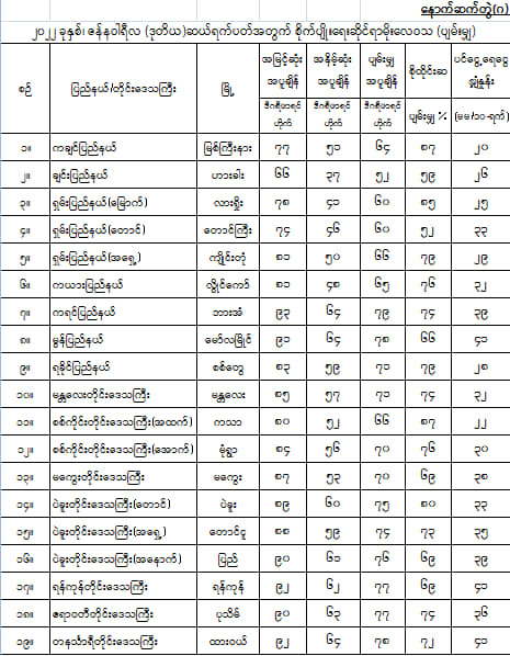 ၂၀၂၂ ခုနှစ်၊ ဇန်နဝါရီလ(ပထမ)ဆယ်ရက်ပတ်အတွင်း (မြေဆီလွှာစိုစွတ်မှု)အခြေအနေများမှာ စစ်ကိုင်းတိုင်းဒေသကြီး၊ မန္တလေးတိုင်းဒေသကြီး၊ မကွေးတိုင်းဒေသကြီး၊ ပဲခူးတိုင်းဒေသကြီး၊ ရန်ကုန်တိုင်းဒေသကြီး၊ ဧရာဝတီတိုင်းဒေသကြီး၊ တနင်္သာရီတိုင်းဒေသကြီး၊ ကချင်ပြည်နယ်၊ ချင်းပြည်နယ်၊ ရှမ်းပြည်နယ်၊ ရခိုင်ပြည်နယ်၊ ကယားပြည်နယ်၊ ကရင်ပြည်နယ်နှင့် မွန်ပြည်နယ်တို့တွင် (ခြောက်သွေ့)အခြေအနေအသီးသီး ရှိခဲ့ပါသည်။