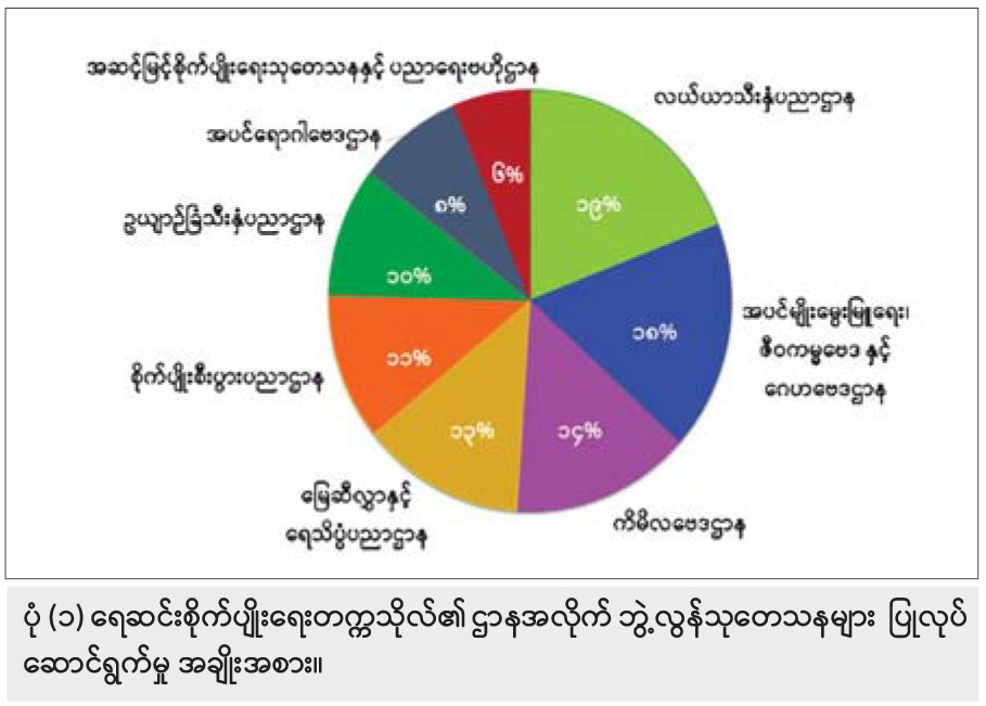 ထို့အပြင် စိုက်ပျိုးရေးကဏ္ဍ၏ ကုန်ကြမ်းများကိုအသုံးပြု၍ စက်မှုကဏ္ဍ ဖွံ့ဖြိုးတိုးတက်စေရန် ရည်ရွယ်ပြီး နိုင်ငံ၏စားသုံးကုန်နှင့် လူသုံးကုန်ချော ပစ္စည်းများအား ထုတ်လုပ်နိုင်မည့် ဝါသီးနှံ၊ ရော်ဘာနှင့် ကြံအစရှိသော စက်မှုကုန်ကြမ်းသီးနှံများဆိုင်ရာ သုတေသနပေါင်း ၉၀ (၉ ဒသမ ၄ ရာခိုင်နှုန်း)၊ လူသားတို့၏ နေ့စဉ်ဘဝတွင် စားသုံး ရန် အရေးကြီးသည့် ဟင်းသီးဟင်းရွက်ဆိုင်ရာ သုတေသနပေါင်း ၆၆ ခု (၆ ဒသမ ၉ ရာခိုင်နှုန်း)၊ နိုင်ငံတော်၏ စားသုံးဆီကဏ္ဍ ဖွံ့ဖြိုးတိုးတက်စေ ရေးနှင့် ပြည်တွင်းစားသုံးဆီဖူလုံမှုအတွက် အရေး ကြီးသော ဆီထွက်သီးနှံများဆိုင်ရာ သုတေသန ပေါင်း ၆၄ ခု (၆ ဒသမ ၇ ရာခိုင်နှုန်း) တို့ကိုလည်း ဆောင်ရွက်ခဲ့ပါသည်။ ထို့အပြင် အခြားနှံစားသီးနှံများ၊ သစ်သီးဝလံများ၊ စားဖိုဆောင်သီးနှံများ၊ ပန်းမန်များ၊ နှစ်ရှည်သီးနှံများ၊ ဥစားသီးနှံများ၊ ဈေးကွက်ဝင်သစ်သီးများနှင့် စားကျက်သီးနှံဆိုင်ရာ သုတေသနများကိုလည်း မလစ်လပ်စေဘဲ ဆောင်ရွက်ခဲ့ပါသည်။ (ပုံ-၂)