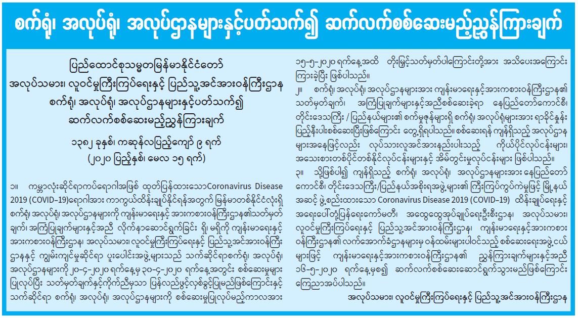 စက်ရုံ၊ အလုပ်ရုံ၊ အလုပ်ဌာနများနှင့် ပတ်သက်၍ ဆက်လက်စစ်ဆေးမည့် ညွှန်ကြားချက်