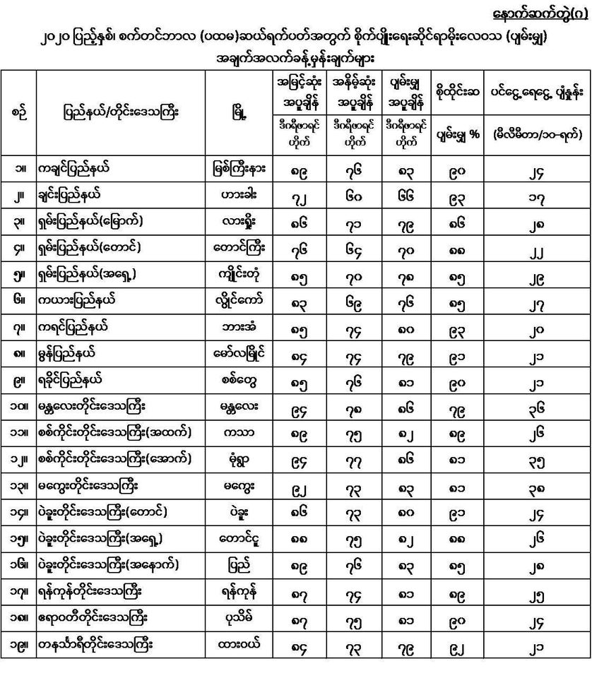 မိုးရွာသွန်းမှု အခြေအနေ---------၂၀၂၀ ပြည့်နှစ်၊ ဩဂုတ်လ (တတိယ)ဆယ်ရက်ပတ်အတွင်း မိုးရွာသွန်းမှု အခြေအနေများမှာ - မန္တလေးတိုင်းဒေသကြီး၊ ပဲခူးတိုင်းဒေသကြီး (တောင်ပိုင်းနှင့် အနောက်ပိုင်း)၊ ရခိုင်ပြည်နယ်နှင့် မွန်ပြည်နယ်တို့တွင် ဩဂုတ်လ (တတိယ)ဆယ်ရက်ပတ်၏ ပျမ်းမျှမိုးရေချိန်ခန့်သာရှိခဲ့ပြီး၊ ပဲခူးတိုင်းဒေသကြီး(အရှေ့ပိုင်း)၊ ရှမ်းပြည်နယ်(တောင်ပိုင်း)နှင့် ကယားပြည်နယ်တို့တွင် ဩဂုတ်လ (တတိယ)ဆယ်ရက်ပတ်၏ ပျမ်းမျှမိုးရေချိန်တို့ထက်ပိုခဲ့ကာ၊ စစ်ကိုင်းတိုင်းဒေသကြီး၊ မကွေးတိုင်းဒေသကြီး၊ ရန်ကုန်တိုင်းဒေသကြီး၊ ဧရာဝတီတိုင်းဒေသကြီး၊ တနင်္သာရီတိုင်းဒေသကြီး၊ ကချင်ပြည်နယ်၊ ချင်းပြည်နယ်၊ ရှမ်းပြည်နယ်(အရှေ့ပိုင်းနှင့်မြောက်ပိုင်း)နှင့် ကရင်ပြည်နယ်တို့တွင် ဩဂုတ်လ (တတိယ) ဆယ်ရက်ပတ်၏ ပျမ်းမျှမိုးရေချိန်တို့အောက် လျော့နည်းခဲ့ပါသည်။
