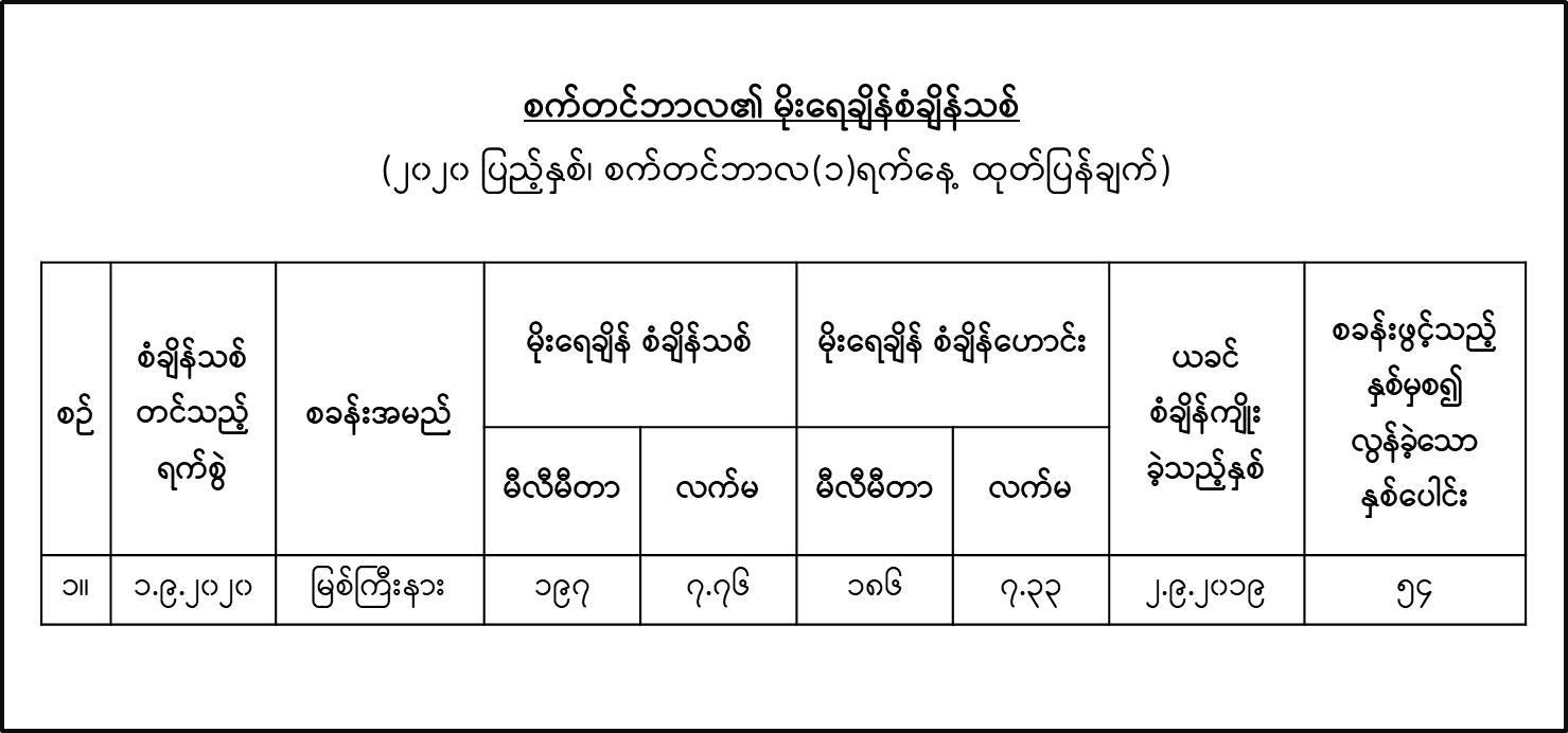 ၂၀၂၀ ပြည့်နှစ်၊ စက်တင်ဘာလ (၁)ရက်နေ့ မြန်မာစံတော်ချိန် (ဝ၉:၃၀)နာရီအချိန် တိုင်းထွာချက်များအရ မြစ်ကြီးနားစခန်း၌ စက်တင်ဘာလ၏ (၂၄)နာရီအတွင်း ရွာသွန်းခဲ့သော မိုးရေချိန်စံချိန်သစ်