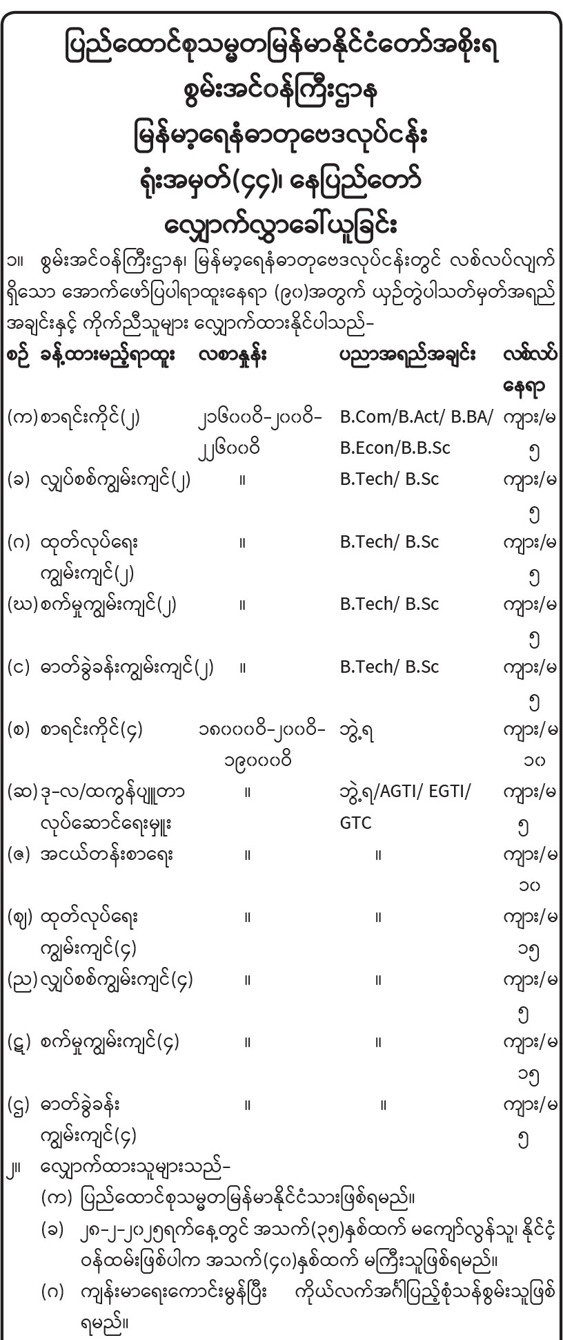 စွမ်းအင်ဝန်ကြီးဌာန၊ မြန်မာ့ရေနံဓာတုဗေဒလုပ်ငန်းတွင် လစ်လပ်လျက်ရှိသော ရာထူးနေရာ (၉၀) အတွက် သတ်မှတ်အရည်အချင်းနှင့် ကိုက်ညီသူများ လျှောက်ထားနိုင်