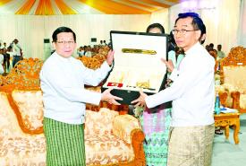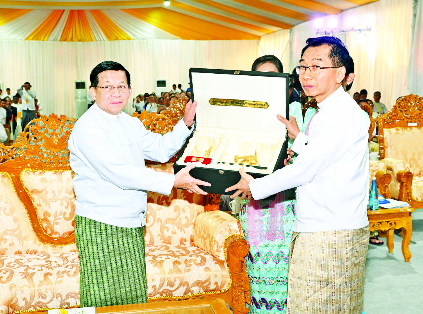 ဆက်လက်၍ နိုင်ငံတော်ယာယီ သမ္မတ နိုင်ငံတော်လုံခြုံရေးနှင့် အေးချမ်းသာယာရေး ကော်မရှင် ဥက္ကဋ္ဌထံ စွမ်းအင်ဝန်ကြီးဌာန ပြည်ထောင်စုဝန်ကြီးက စွမ်းအင်ဝန်ကြီးဌာန နှစ်(၄၀)ပြည့် ပတ္တမြားရတုနှင့် သန်လျင်ရေနံချက်စက်ရုံ ရာပြည့်အထိမ်းအမှတ် ဂါရဝပြု လက်ဆောင်အား ပေးအပ်သည်။