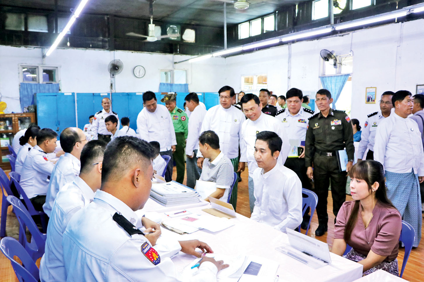 ဆက်လက်၍ ပြည်ထောင်စုဝန်ကြီးနှင့် တိုင်းဒေသကြီးဝန်ကြီးချုပ်တို့သည် အလုံခရိုင် ဦးစီးမှူးရုံးအတွင်း ဝန်ထမ်းများ ရုံးလုပ်ငန်း ဆောင်ရွက်နေမှုနှင့် ရုံးစာရွက်စာတမ်းများ ထိန်းသိမ်းထားရှိမှု တို့ကို လှည့်လည်ကြည့်ရှုစစ်ဆေးပြီး ပြည်ထောင်စုဝန်ကြီးက ရွေးကောက်ပွဲ အောင်မြင်စွာ ကျင်းပနိုင်ရေးအတွက် ဆောင်ရွက်ရမည့်လုပ်ငန်းများ အချိန်မီပြီးစီး အောင်မြင်စေရန် ဆက်စပ်ဌာနများနှင့် ညှိနှိုင်းပေါင်းစပ်ဆောင်ရွက်ရေး၊ လုံခြုံရေးအသိ၊ လုံခြုံရေးသတိ အမြဲရှိစေရေး မှာကြားသည်။