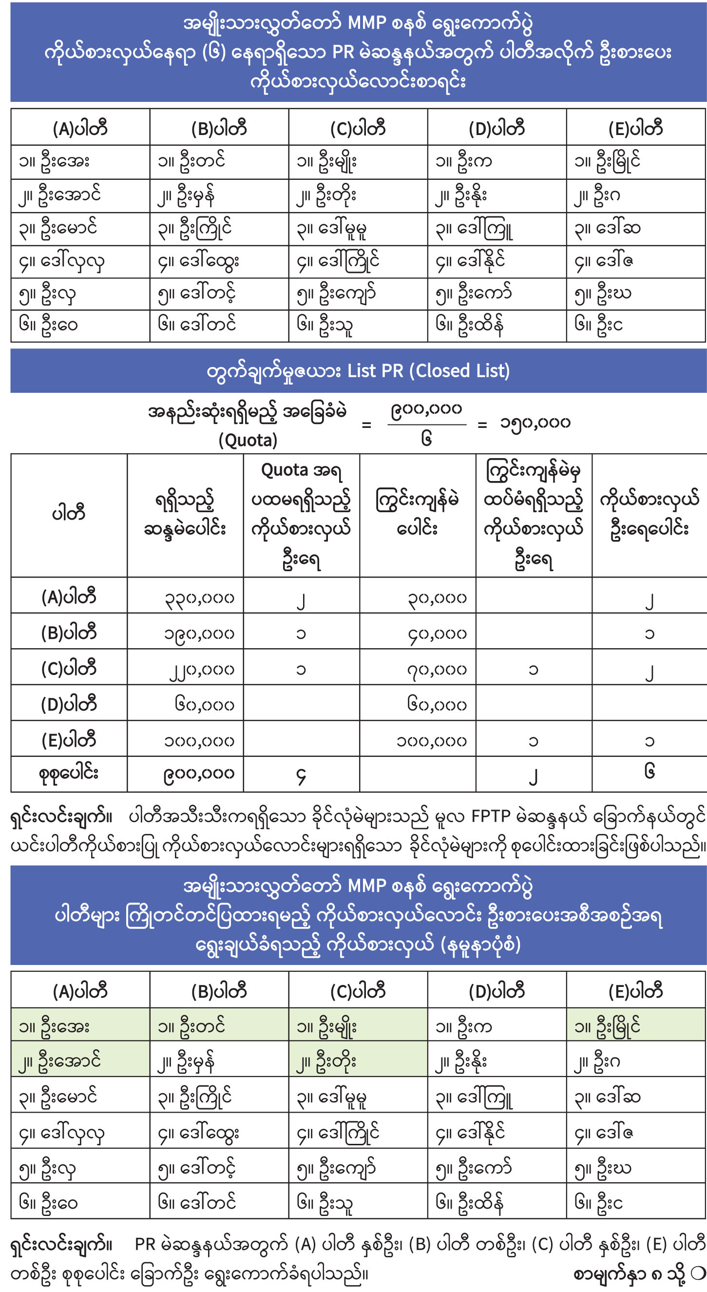 ဤနေရာတွင် MMP စနစ်အရ FPTP ကနေ PR စနစ်ကို ကူးပြောင်းသည့် ပုံစံ အရေးကြီးပါသည်။ FPTP မဲဆန္ဒနယ် (အမျိုးသားလွှတ်တော်အတွက် ကိုယ်ပိုင်အုပ်ချုပ်ခွင့်ရတိုင်း၊ ဒေသ မပါ) တွင် ပါတီ ကိုယ်စားပြုကိုယ်စားလှယ်လောင်း ဝင်ရောက်ယှဉ်ပြိုင်ကြသည့်ပါတီများက FPTP မဲဆန္ဒနယ် အကျုံးဝင်သည့် PR မဲဆန္ဒနယ်အတွက်လည်း ရွေးကောက်ရမည့် ကိုယ်စားလှယ်အရေအတွက် အတိုင်း အမည်စာရင်းတင်သွင်းရမည် ဖြစ်ပါသည်။ FPTP မဲဆန္ဒနယ်တွင် ကိုယ်စားလှယ်ကရရှိသည့် ဆန္ဒမဲကို PR မဲဆန္ဒနယ်အတွက် ပါတီကရရှိသည့် ဆန္ဒမဲအဖြစ် စုစည်းတွက်ချက်သွားမည် ဖြစ်ပါ သည်။ PR မဲဆန္ဒနယ်အတွက် ပါတီအသီးသီးက စုစည်းရရှိသည့် ဆန္ဒမဲများအပေါ်မူတည်ပြီး ပါတီအများသိပြီးဖြစ်သော ရိုးရှင်းလွယ်ကူသည့် Closed List PR စနစ်၊ အနည်းဆုံးရရှိရမည့် အခြေခံမဲ Hare Quota တွက်နည်း၊ ကြွင်းကျန်မဲအများဆုံးနည်းလမ်း (The Largest Remainder Method) တို့ဖြင့် ပါတီအချိုးကျ PR ကိုယ်စားလှယ်များကို ဥပဒေအတိုင်း တွက်ချက်သွားမည်ဖြစ်ပါသည်။ ထိုသို့ တွက်ချက်ရာတွင် PR မဲဆန္ဒနယ်များသည် ပါတီအချိုးကျ ကိုယ်စားလှယ်များအတွက် သတ်မှတ်ခြင်းဖြစ် သဖြင့် FPTP မဲဆန္ဒနယ်မှ တစ်သီးပုဂ္ဂလများရရှိသော ခိုင်လုံမဲများကို PR မဲဆန္ဒနယ်တွင် ထည့်သွင်းတွက်ချက်ခြင်း မပြုကြောင်း သိရှိထားရန်လိုပါသည်။