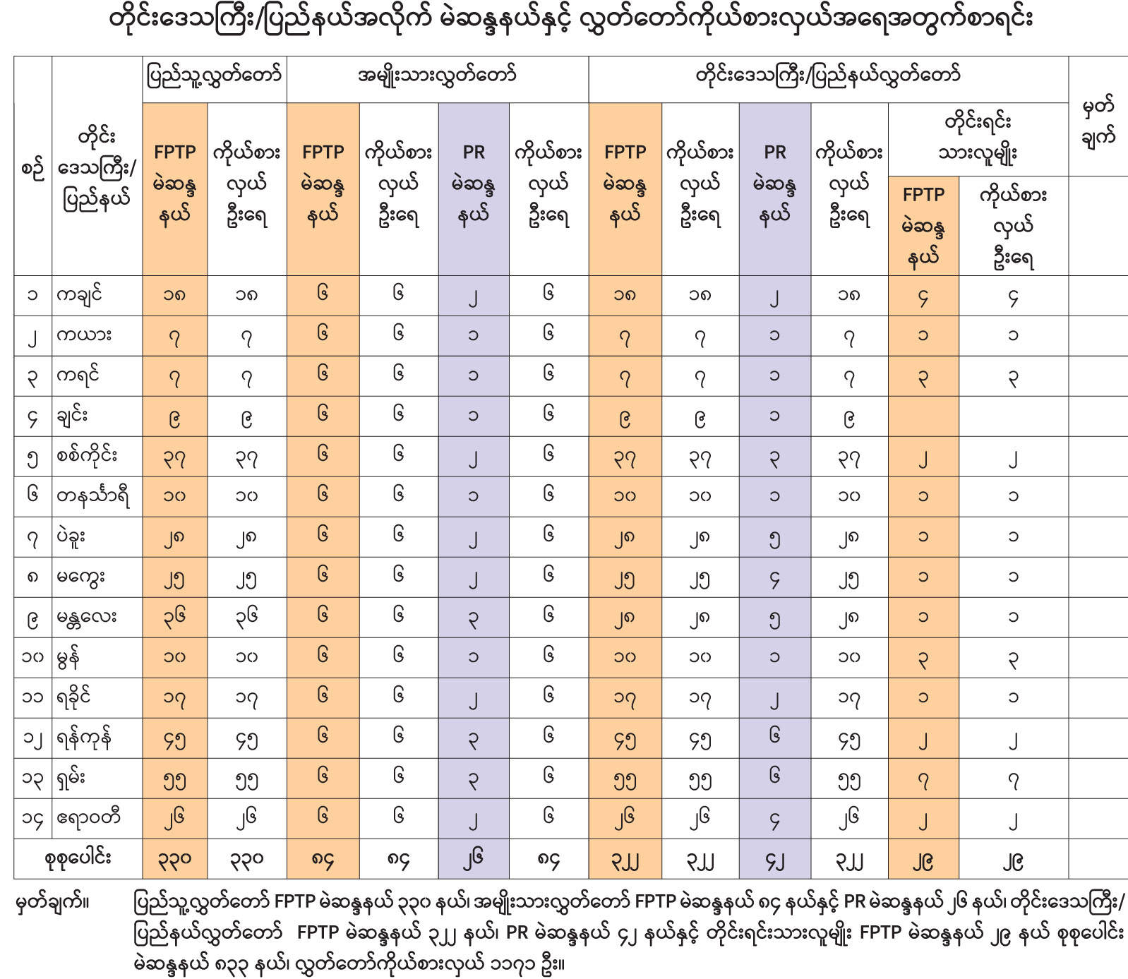 ရွေးကောက်ပွဲတွင် ပြည်သူ့လွှတ်တော်အတွက် FPTP မဲဆန္ဒနယ် ၃၃၀ နယ်မှ ကိုယ်စားလှယ် ၃၃၀၊ အမျိုးသားလွှတ်တော်အတွက် FPTP မဲဆန္ဒနယ် ၈၄ နယ်မှ ကိုယ်စားလှယ် ၈၄ ဦးနှင့် PR မဲဆန္ဒနယ် ၂၄ နယ်မှ ကိုယ်စားလှယ် ၈၄ ဦး၊ တိုင်းဒေသကြီး လွှတ်တော်/ ပြည်နယ်လွှတ်တော်များအတွက် FPTP မဲဆန္ဒနယ် ၃၂၂ နယ်မှ ကိုယ်စားလှယ် ၃၂၂ ဦး၊ PR မဲဆန္ဒနယ် ၄၂ နယ်မှ ကိုယ်စားလှယ် ၃၂၂ ဦးနှင့် တိုင်းရင်းသားလူမျိုးမဲဆန္ဒနယ် ၂၉ နယ်မှ ကိုယ်စားလှယ် ၂၉ ဦး စုစုပေါင်း မဲဆန္ဒနယ် ၈၃၃ နယ်မှ ကိုယ်စားလှယ် ၁၁၇၁ ဦး ရွေးကောက် တင်မြှောက်မည်ဖြစ်ပါသည်။ (တိုင်းဒေသကြီး၊ ပြည်နယ်အလိုက် မဲဆန္ဒနယ်စာရင်းနှင့် လွှတ်တော် ကိုယ်စားလှယ်အရေအတွက်စာရင်းကို ဇယားဖြင့် ဖော်ပြထားပါသည်။)