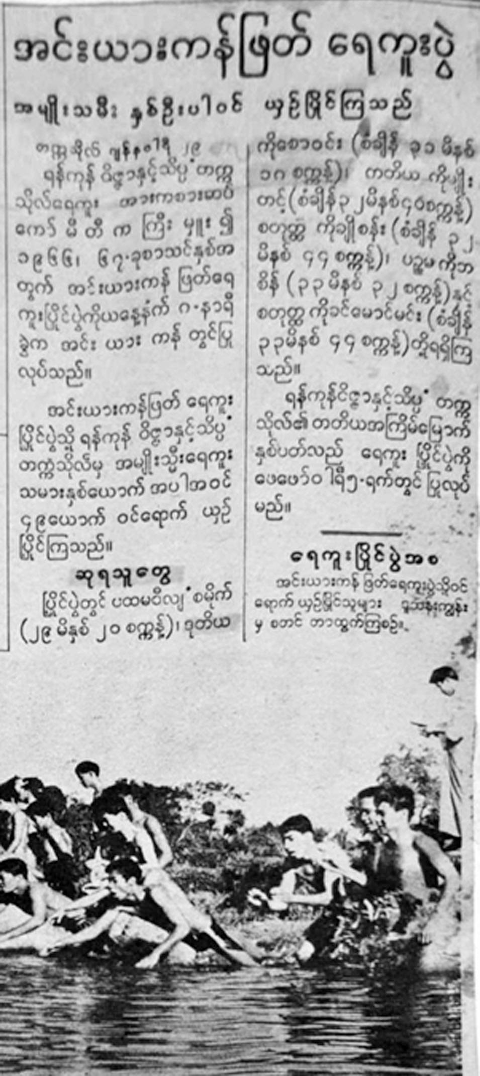 စနစ်သစ်ပညာရေးအစ ၁၉၆၄ မှ ၁၉၆၈ နှစ်များအတွင်း တက္ကသိုလ်နယ်မြေ သထုံ လမ်းရှိ တက္ကသိုလ် ရေကူးကန်နဲ့ အင်းယား ကန်မှာ ကျင်းပခဲ့တဲ့ ရေကူးပြိုင်ပွဲများနဲ့ ယင်းပြိုင်ပွဲတွေမှာ မြန်မာနိုင်ငံအရပ်ရပ်မှ ရန်ကုန်ရှိ တက္ကသိုလ်ကျောင်းများသို့ ပညာ ဆည်းပူးရန် ရောက်ရှိလာကြတဲ့ ကျောင်းသားကျောင်းသူများ ယှဉ်ပြိုင်ကူးခတ်ခဲ့ကြပုံများနဲ့ ပတ်သက်ပြီး ကျွန်မကိုယ်တိုင် တက္ကသိုလ်ကျောင်းသူဘဝက ရေကူးပြိုင်ပွဲဝင်သူ တစ်ယောက်အနေနဲ့ တွေ့ကြုံခဲ့ရသည်များကို မှတ်မိသလောက် ဖော်ပြလိုက်ပါတယ်။