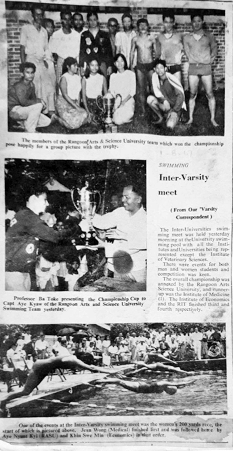 ၁၉၆၄-၆၅ ပညာသင်နှစ် ပြိုင်ပွဲများကို သြဂုတ်လ ၁ ရက်နေ့မှာ ကျင်းပခဲ့ပါတယ်။ ကျွန်မတို့ ဝိဇ္ဇာနှင့် သိပ္ပံတက္ကသိုလ် ( RASU) အနေနဲ့ အမျိုးသမီးအသင်းမှာ နောက်ဆုံးမှ သာ ပန်းဝင်ခဲ့ပြီး RASU အမျိုးသားအသင်းကတော့ ပွဲစဉ်တိုင်းဝင်ပြိုင်နိုင်ပြီး ဆုတံဆိပ်များ ရရှိခဲ့ပါတယ်။ အမျိုးသမီးအသင်းကမူ ပွဲစဉ် တိုင်း ဝင်ရောက်နိုင်ခြင်း မရှိတဲ့အတွက် ငွေတံဆိပ်နှစ်ခု၊ ကြေးတံဆိပ်တစ်ခုသာ ရခဲ့ပါတယ်။ အမျိုးသမီးပြိုင်ပွဲဝင်များဟာ လည်း တစ်ဦးချင်း ဆုတံဆိပ်ရရှိရေးကို ပဓာန မထားဘဲ၊ မိမိတို့ တက္ကသိုလ်အသင်း အမှတ်များများရရှိရေးအတွက် အားကစား စိတ်ဓာတ်အပြည့်နဲ့ ယှဉ်ပြိုင်ခဲ့ကြပါတယ်။ RASU အမျိုးသားပြိုင်ပွဲနဲ့ အမျိုးသမီးပြိုင်ပွဲ များအားလုံးမှာ ရရှိတဲ့ ရမှတ်များရဲ့ စုစုပေါင်း ရမှတ်ဟာ အခြားအသင်းတွေ ရမှတ်ထက် အများဆုံးရရှိခဲ့လို့ ၁၉၆၅ ခုနှစ်အတွက် တက္ကသိုလ်ပေါင်းစုံရေကူးပြိုင်ပွဲမှာ တံခွန်စိုက် ဒိုင်းဆု ရရှိခဲ့ပါတယ်။