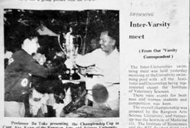 ကျွန်မတို့ တက္ကသိုလ်အမျိုးသားပွဲစဉ်များ မှာတော့ အခြားတက္ကသိုလ်များနဲ့ ကြိုးစား ယှဉ်ပြိုင်ခဲ့ကြရပြီး ပွဲတိုင်းမှာ ဆုတံဆိပ်များ ရရှိကြပါတယ်။ ပြိုင်ပွဲကျင်းပနေစဉ်အတွင်း အသင်းလိုက်ရရှိကြတဲ့ အမှတ်တွေကိုလည်း အချိန်နဲ့တစ်ပြေးညီ ကြေညာပေးလျက်ရှိ သဖြင့် ပြိုင်ပွဲများမပြီးခင်အထိ ဆေး(၁)က အမှတ်သာလိုက်၊ RASU က အမှတ်သာလိုက် ဖြစ်နေပါတယ်။ ပွဲစဉ်အားလုံး ပြီးဆုံးသွားတဲ့ နောက် နောက်ဆုံးရလဒ်မှာ ဆေး(၁) က RASU ထက် ၆ မှတ်အသာနဲ့ ၁၉၆၆ ခုနှစ် အတွက် ရေကူးတံခွန်စိုက်ဒိုင်းကို ရရှိသွား ခဲ့ပါတယ်။