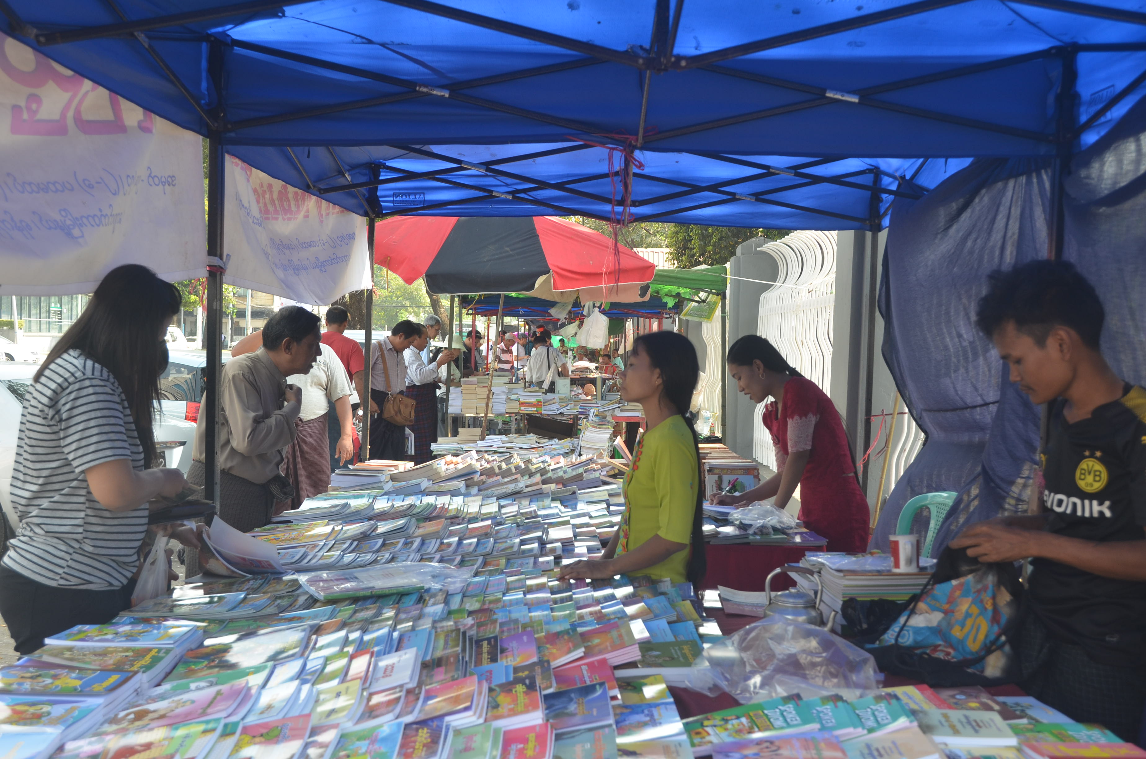 ရန်ကုန်မြို့ သိမ်ဖြူလမ်း ဝန်ကြီးများရုံးရှေ့ရှိ Yangon Book Street စနေ-တနင်္ဂနွေ စာအုပ်လမ်းတွင် ယနေ့နံနက်ပိုင်းကစတင်ကာ စာအုပ်ဆိုင်များ ဖွင့်လှစ်ရောင်းချလျက်ရှိပြီး စာပေဟောပြောပွဲကိုလည်း ထည့်သွင်းကျင်းပခဲ့ရာ စာပေချစ်မြတ်နိုးသူများ၊ စာအုပ်လာရောက်ဝယ်ယူသူများ၊ လေ့လာသူများဖြင့် စည်ကားလျက်ရှိသည်။