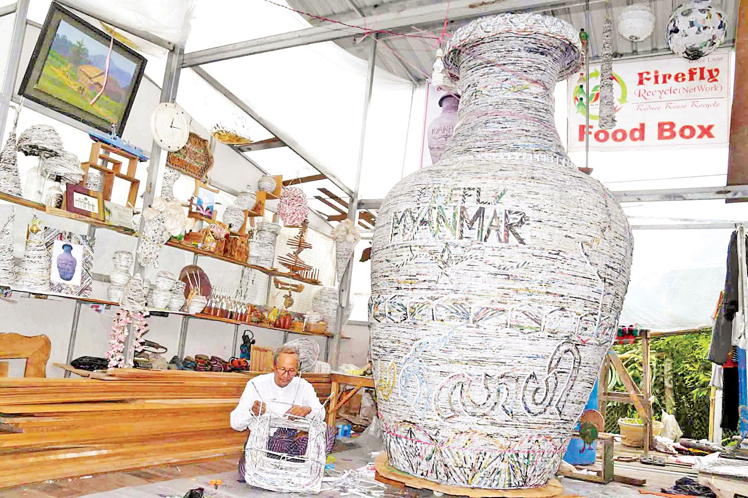 သတင်းစာ၊ ဂျာနယ်စက္ကူ အဟောင်းများဖြင့် ဖန်တီး ပြုလုပ်ထားသော ထိုအလှပန်းအိုးကြီးနံဘေးတွင် စက္ကူ ဖြတ်စ အလိပ်ကလေးများကို အသုံးပြုကာ လက်မှုအနုပညာပစ္စည်းတစ်ခုကို စိတ်ပါလက်ပါ အနုစိတ် ဖန်တီးနေသည့် အမျိုးသားတစ်ဦး။