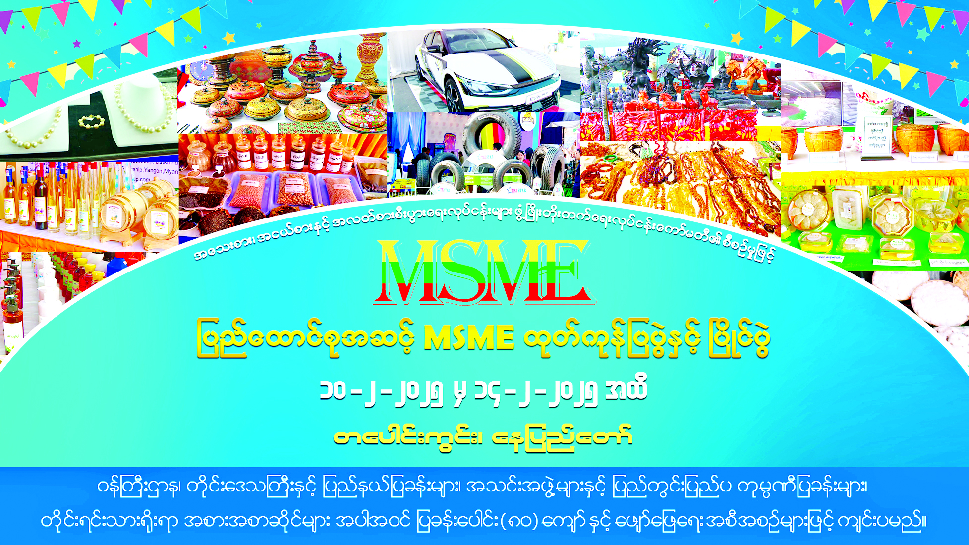 အဆိုပါ ပြပွဲပြိုင်ပွဲတွင် တိုင်းဒေသကြီး နှင့်ပြည်နယ်များမှ MSME ထုတ်ကုန်များ၊ ဒေသထွက် ကုန်ပစ္စည်းများ၊ လယ်ယာလုပ်ငန်းနှင့်စက်မှုလုပ်ငန်းများ၊ ရိုးရာအစားအစာများ ခင်းကျင်းပြသရောင်းချ သွားမည်ဖြစ်သည့်အပြင် ဂီတဖျော်ဖြေပွဲများကိုလည်း ထည့်သွင်းကျင်းပသွားမည်ဖြစ်ကြောင်း သိရသည်။
