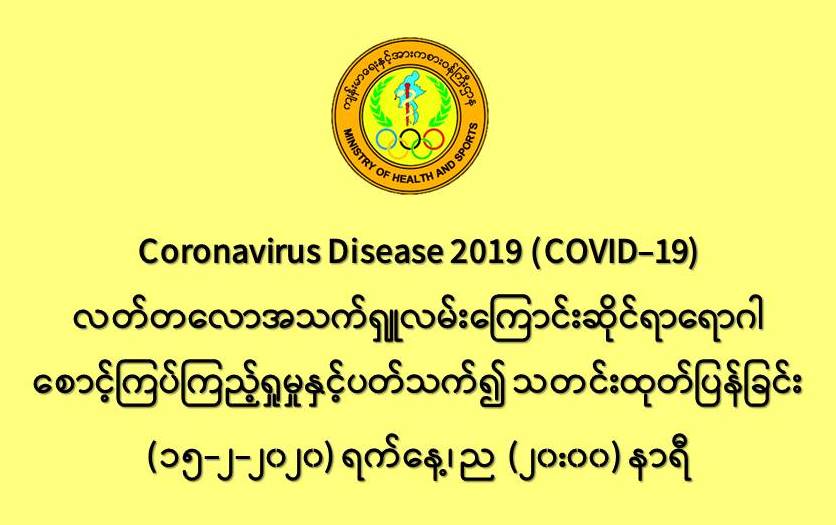 ၁။ ကျန်းမာရေးနှင့်အားကစားဝန်ကြီးဌာနသည် တရုတ်ပြည်သူ့သမ္မတနိုင်ငံနှင့် ကမ္ဘာ့နိုင်ငံ အချို့တွင် ကူးစက်ပျံ့နှံ့လျက်ရှိသည့် COVID-19 လတ်တလောအသက်ရှူလမ်းကြောင်းဆိုင်ရာ ရောဂါဖြစ်ပွားမှုဖြစ်စဉ်နှင့်ပတ်သက်၍ ရောဂါစောင့်ကြပ်ကြည့်ရှုခြင်း လုပ်ငန်းများအား အပြည်ပြည်ဆိုင်ရာဝင် ထွက်ဂိတ်များတွင်လည်းကောင်း၊ ဆေးရုံအခြေပြုအဖြစ်လည်းကောင်း၊ ပြည်သူ လူထုအခြေပြု စောင့်ကြပ်ကြည့်ရှုခြင်း လုပ်ငန်းများဖြင့်လည်းကောင်း၊ ပုဂ္ဂလိကဆေးရုံများနှင့် ပူးပေါင်း၍ လည်းကောင်း ဆောင်ရွက်လျက်ရှိပါသည်။