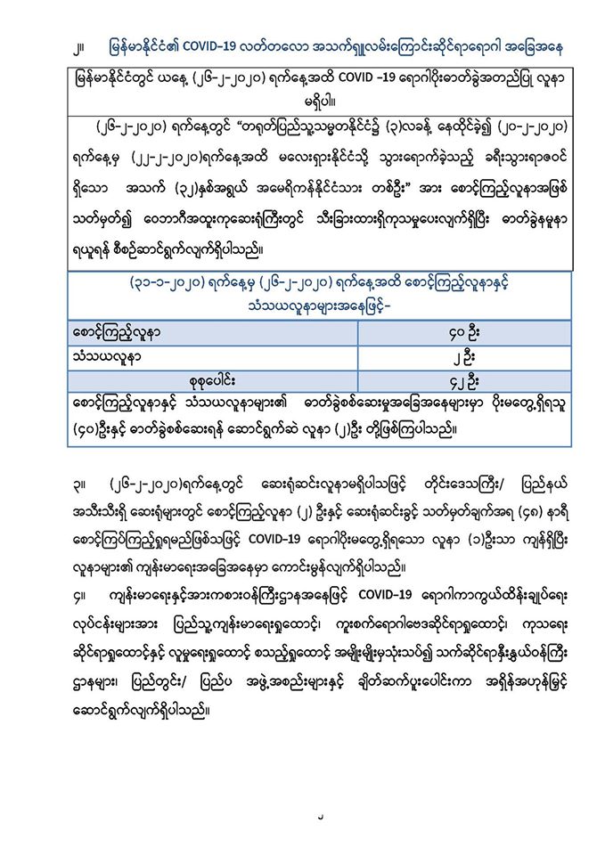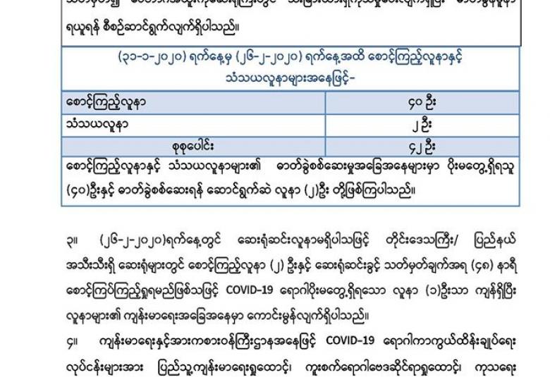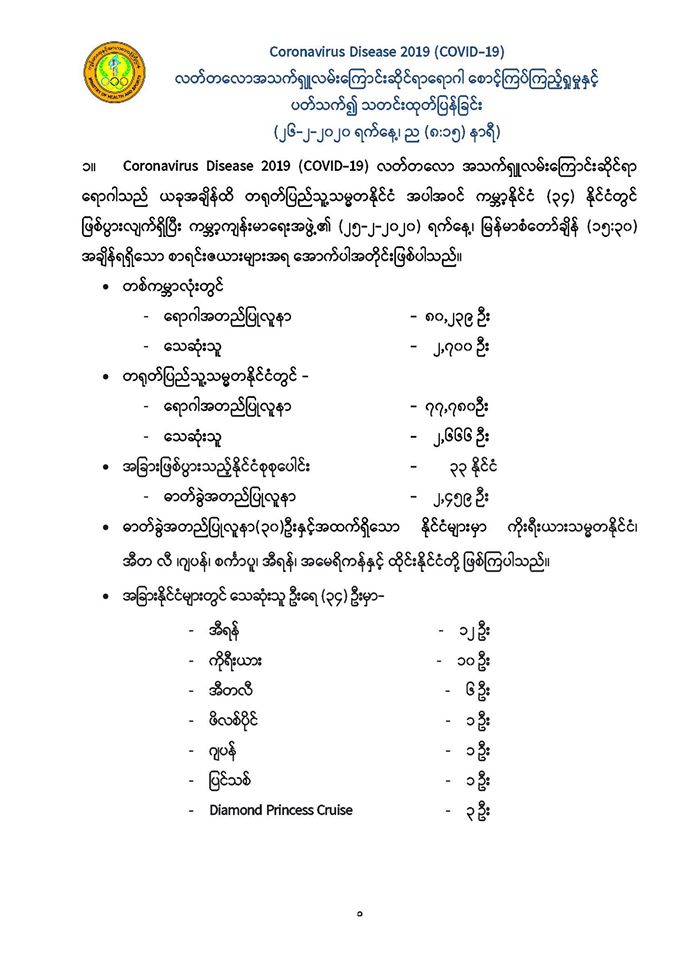 Coronavirus Disease 2019 (COVID-19) လတ်တလောအသက်ရှူလမ်းကြောင်းဆိုင်ရာရောဂါ စောင့်ကြပ်ကြည့်ရှုမှုနှင့် ပတ်သက်၍ သတင်းထုတ်ပြန်ခြင်း