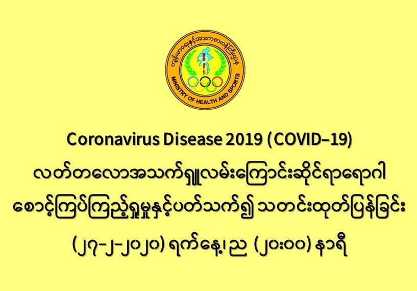 ၂။ ယနေ့ (၂၇-၂-၂၀၂၀) ရက်နေ့၊ နံနက်ပိုင်းတွင် အမျိုးသားကျန်းမာရေးဓာတ်ခွဲမှုဆိုင်ရာဌာန (ရန်ကုန်) ၏ ပြန်ကြားချက်အရ သက်ဆိုင်ရာ ဆေးရုံများတွင် စောင့်ကြပ်ကြည့်ရှုကုသမှုပေးလျက်ရှိသော-