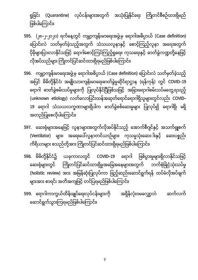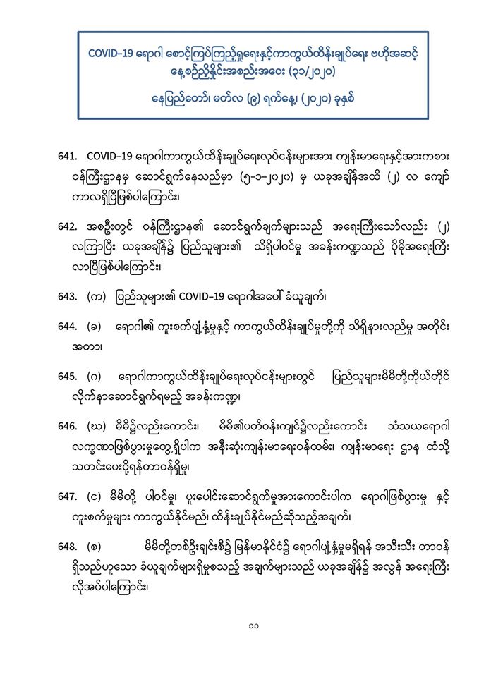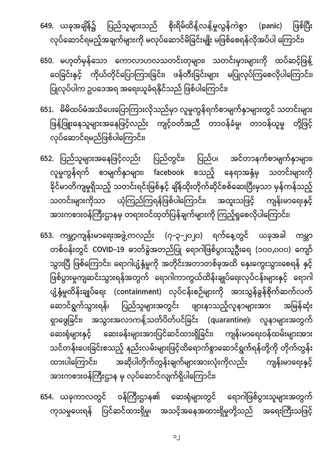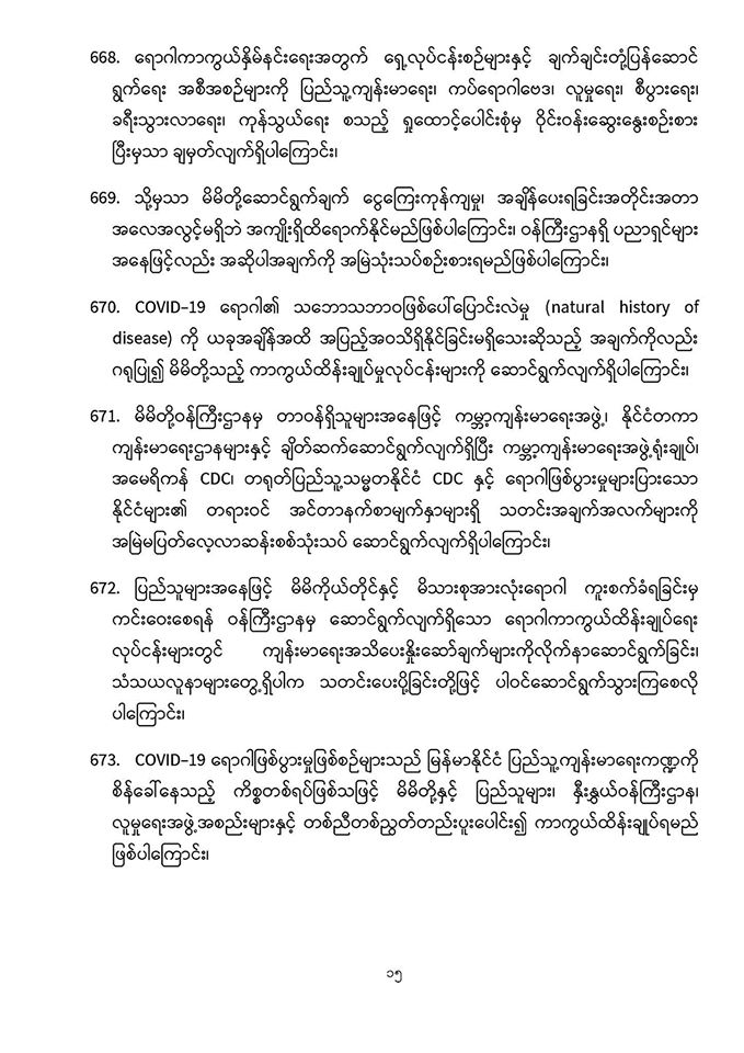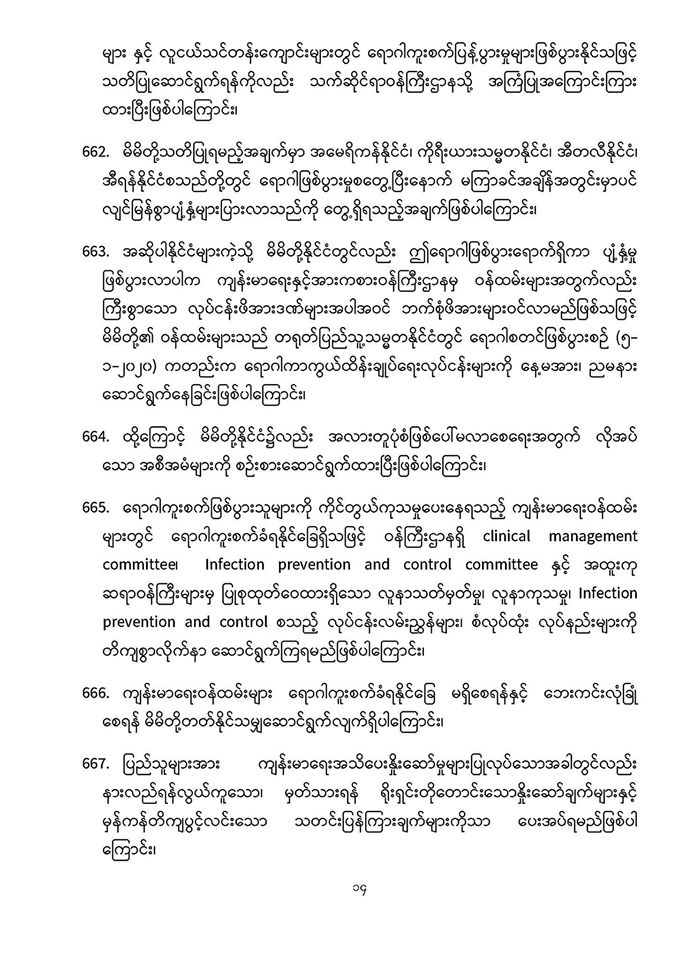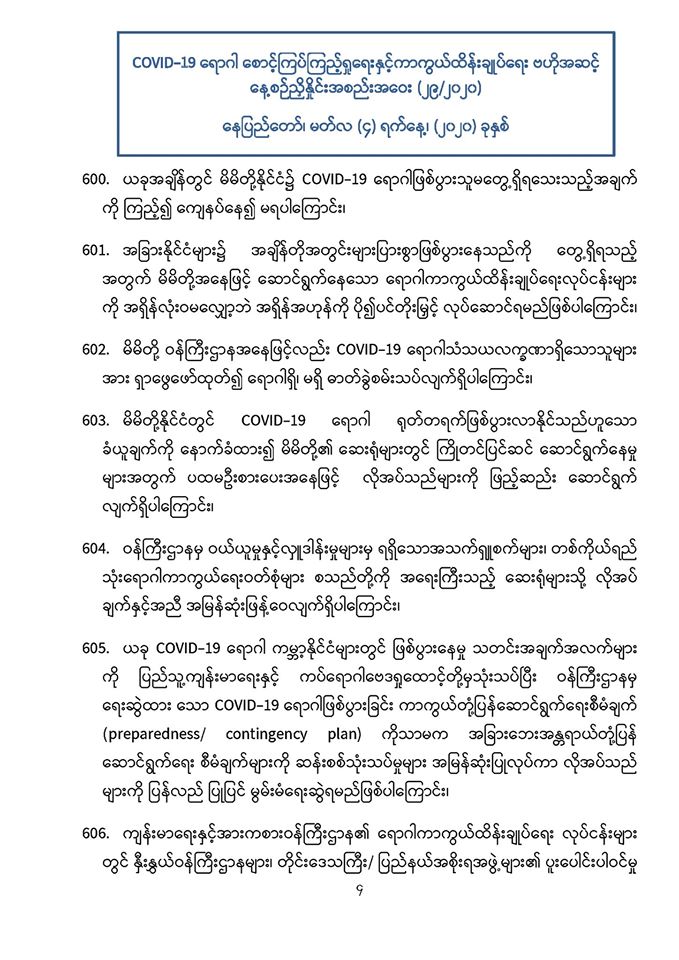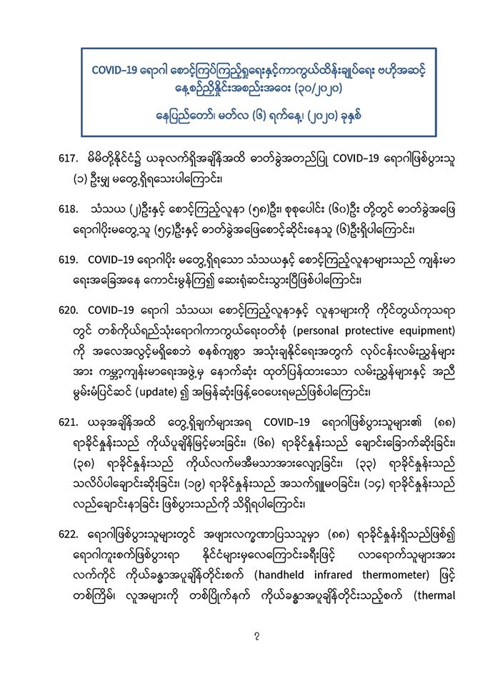 . COVID-19 ရောဂါဖြစ်ပွားမှုဖြစ်စဉ်များသည် မြန်မာနိုင်ငံ ပြည်သူ့ကျန်းမာရေးကဏ္ဍကို စိန်ခေါ်နေသည့် ကိစ္စတစ်ရပ်ဖြစ်သဖြင့် မိမိတို့နှင့် ပြည်သူများ၊ နှီးနွှယ်ဝန်ကြီးဌာန၊ လူမှုရေးအဖွဲ့အစည်းများနှင့် တစ်ညီတစ်ညွတ်တည်းပူးပေါင်း၍ ကာကွယ်ထိန်းချုပ်ရမည် ဖြစ်ပါကြောင်း၊