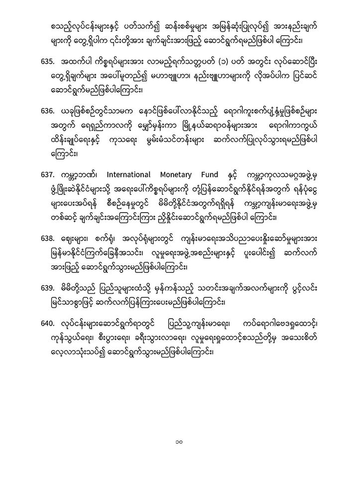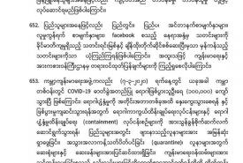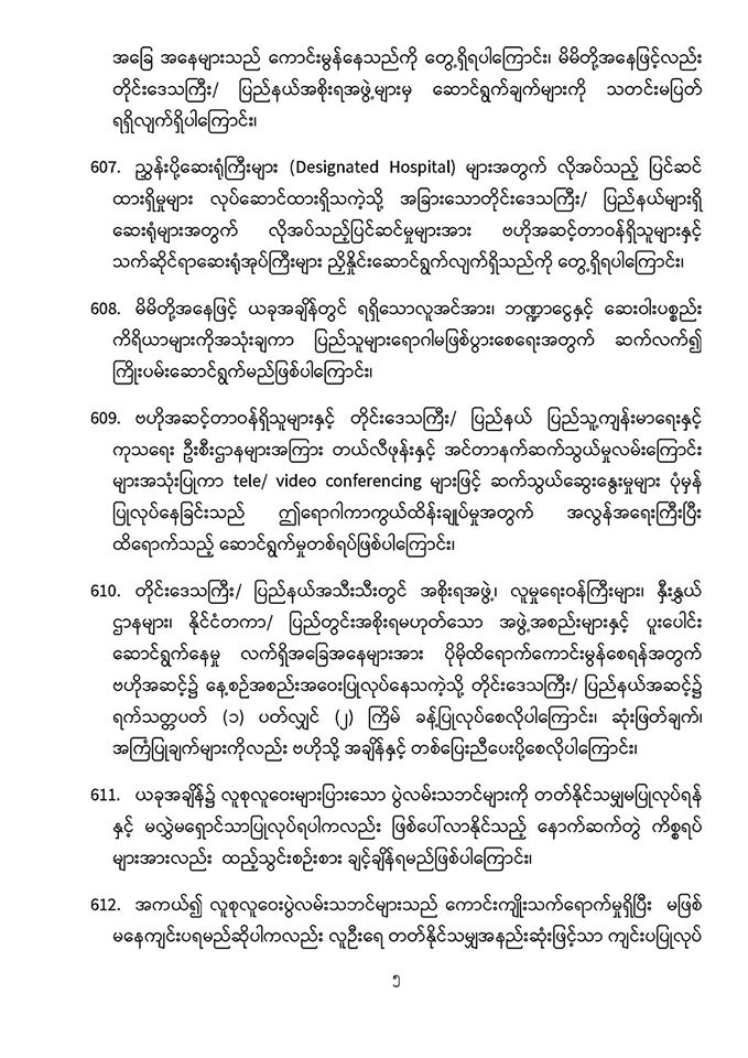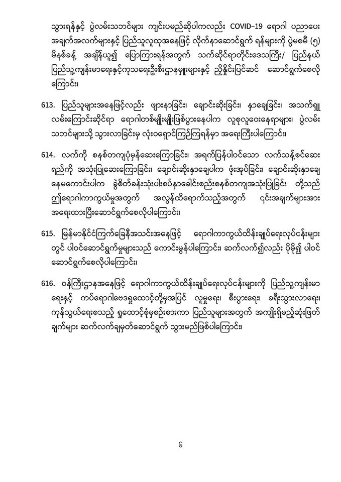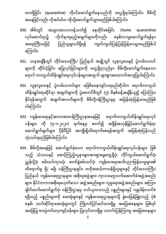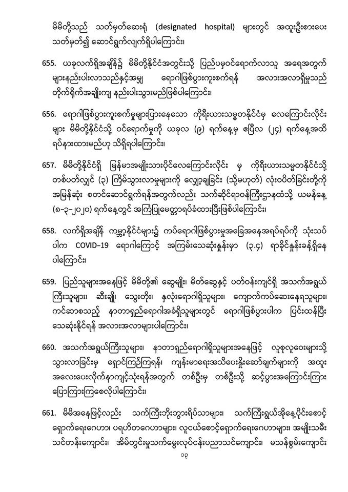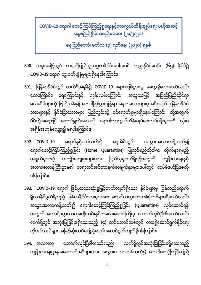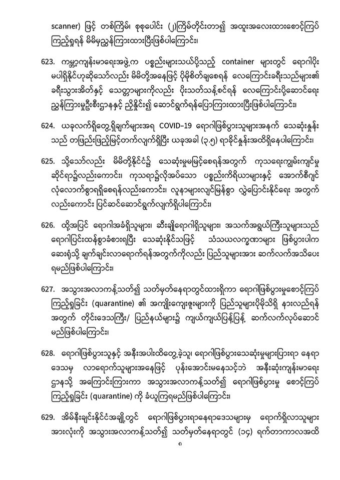 . COVID-19 ရောဂါဖြစ်ပွားမှုဖြစ်စဉ်များသည် မြန်မာနိုင်ငံ ပြည်သူ့ကျန်းမာရေးကဏ္ဍကို စိန်ခေါ်နေသည့် ကိစ္စတစ်ရပ်ဖြစ်သဖြင့် မိမိတို့နှင့် ပြည်သူများ၊ နှီးနွှယ်ဝန်ကြီးဌာန၊ လူမှုရေးအဖွဲ့အစည်းများနှင့် တစ်ညီတစ်ညွတ်တည်းပူးပေါင်း၍ ကာကွယ်ထိန်းချုပ်ရမည် ဖြစ်ပါကြောင်း၊