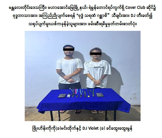 Cover Club ဆိုင်၌ ဗုဒ္ဓဘာသာအား အကြည်ညိုပျက်စေရန် “ဗုဒ္ဓံ သရဏံ ဂစ္ဆာမိ”သီချင်းအား DJ တီးခတ်၍ သရုပ်ပျက်မူးယစ်ကခုန်ခဲ့သူများအား ဖော်ထုတ်ဖမ်းဆီးအရေးယူ