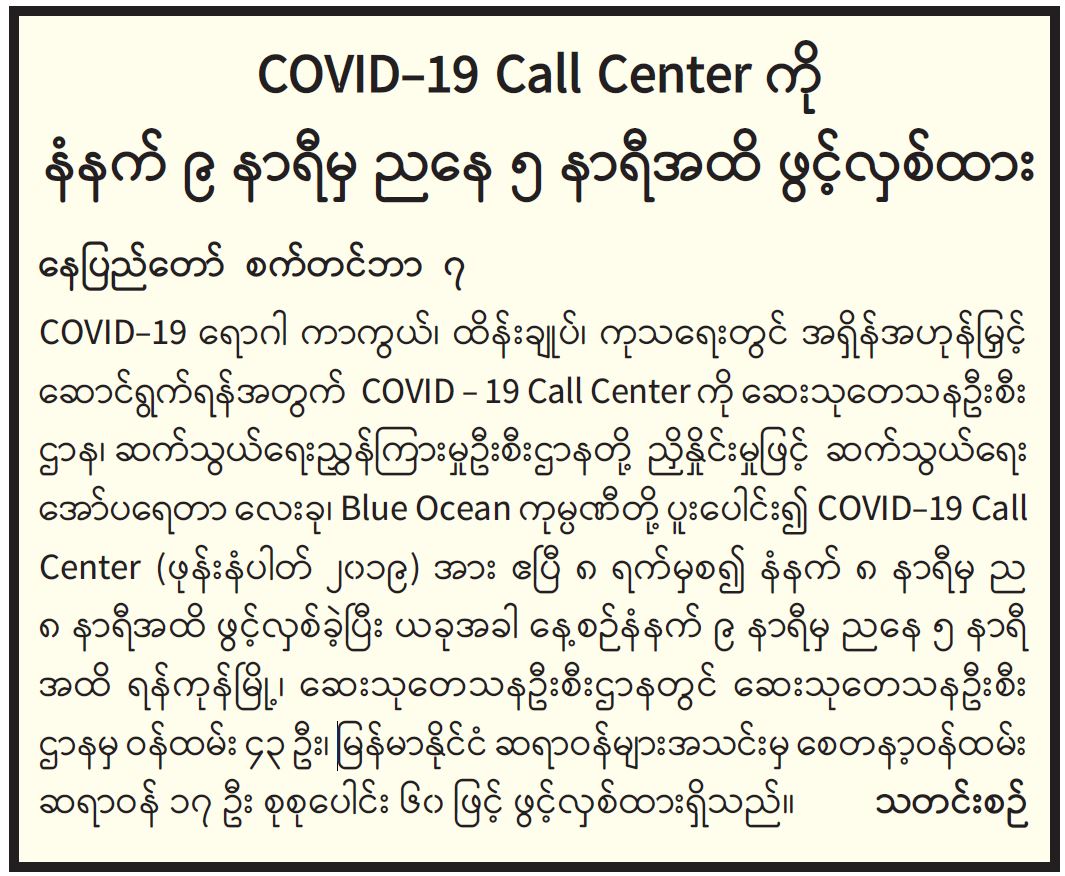 COVID-19 Call Center ကို နံနက် ၉ နာရီမှ ညနေ ၅ နာရီအထိ ဖွင့်လှစ်ထား