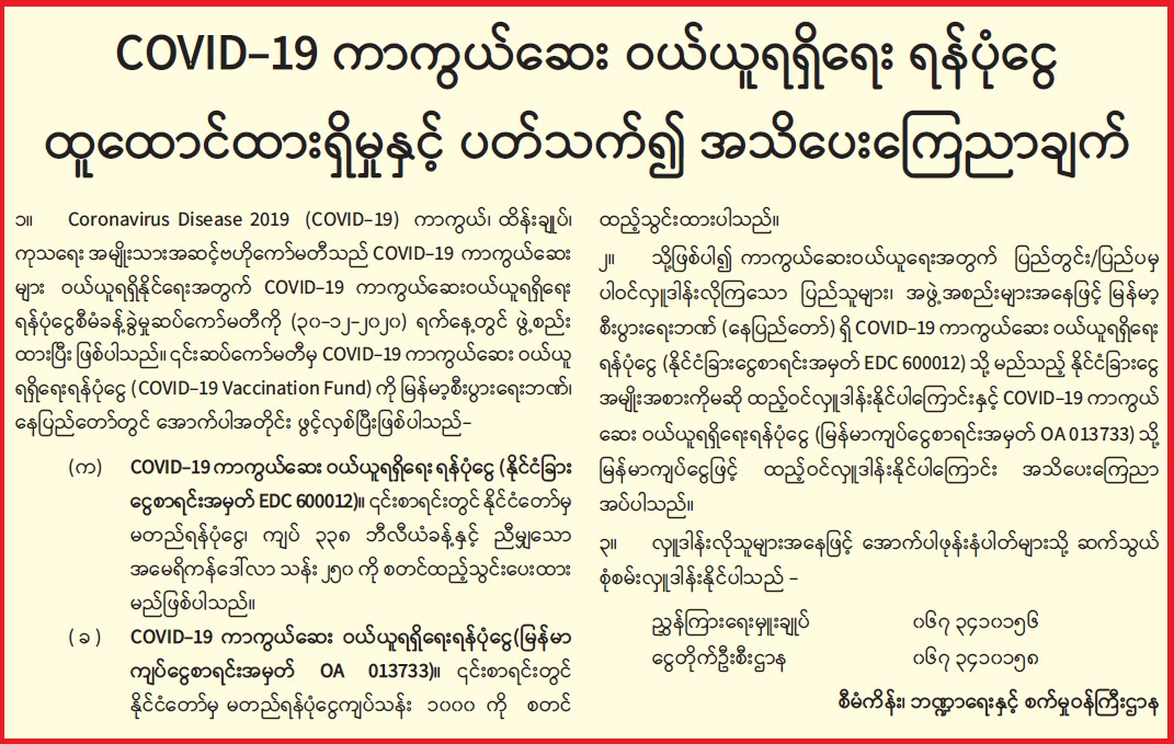 COVID-19 ကာကွယ်ဆေး ဝယ်ယူရရှိရေး ရန်ပုံငွေ ထူထောင်ထားရှိမှုနှင့် ပတ်သက်၍ အသိပေးကြေညာချက်