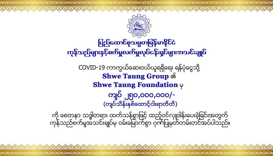 COVID-19 ကာကွယ်ဆေးဝယ်ယူရရှိရေး ရန်ပုံငွေသို့ ထည့်ဝင်လှူဒါန်းပေးသည့် အလှူရှင်များစာရင်းကို ကုန်သည်များနှင့် စက်မှုလက်မှုလုပ်ငန်းရှင်များအသင်းချုပ် (UMFCCI) က ၎င်း၏ ဖေ့စ်ဘုတ်တွင် ရေးသားထားပြီး၊ စေတနာ သဒ္ဓါတရား ထက်သန်စွာဖြင့် ထည့်ဝင်လှူဒါန်းပေးခဲ့ခြင်းအတွက် ဝမ်းမြောက်စွာ ဂုဏ်ပြုမှတ်တမ်း တင်အပ်ကြောင်း ဖော်ပြထားသည်။
