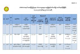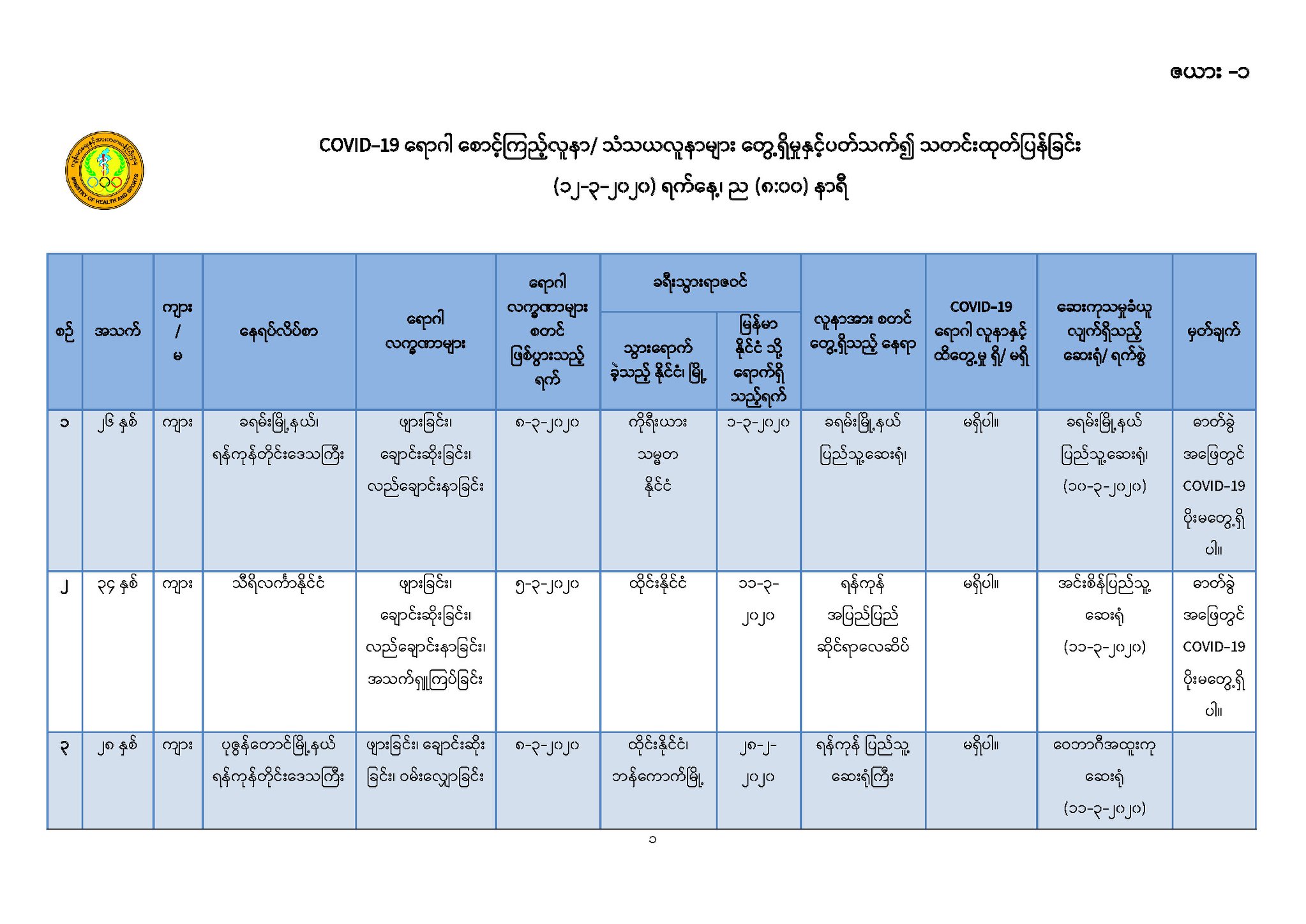 ၁။ ကျန်းမာရေးနှင့်အားကစားဝန်ကြီးဌာနသည် ကမ္ဘာ့နိုင်ငံများတွင် ကူးစက်ပျံ့နှံ့လျက်ရှိသည့် COVID-19 လတ်တလော အသက်ရှူလမ်းကြောင်းဆိုင်ရာ ရောဂါဖြစ်ပွားမှုဖြစ်စဉ်နှင့်ပတ်သက်၍ ရောဂါစောင့်ကြပ်ကြည့်ရှုခြင်း လုပ်ငန်းများအား အပြည်ပြည်ဆိုင်ရာ ဝင်ပေါက်၊ ထွက်ပေါက်ဂိတ် များတွင်လည်းကောင်း၊ ဆေးရုံအခြေပြုအဖြစ်လည်းကောင်း၊ ပြည်သူလူထုအခြေပြု စောင့်ကြပ် ကြည့်ရှုခြင်းလုပ်ငန်းများဖြင့်လည်းကောင်း၊ ပုဂ္ဂလိကဆေးရုံများနှင့် ပူးပေါင်း၍လည်းကောင်း ဆောင်ရွက်လျက်ရှိပါသည်။