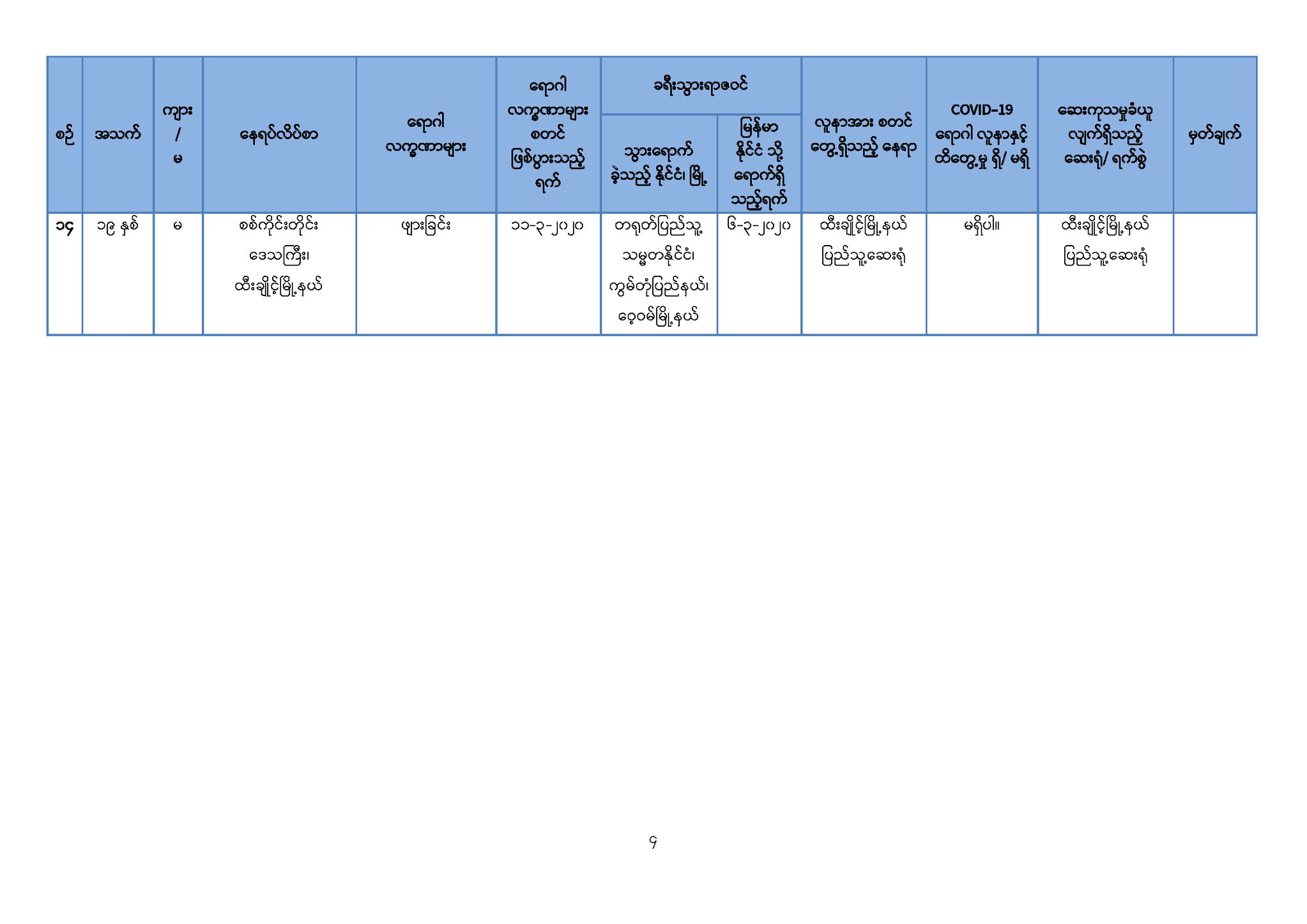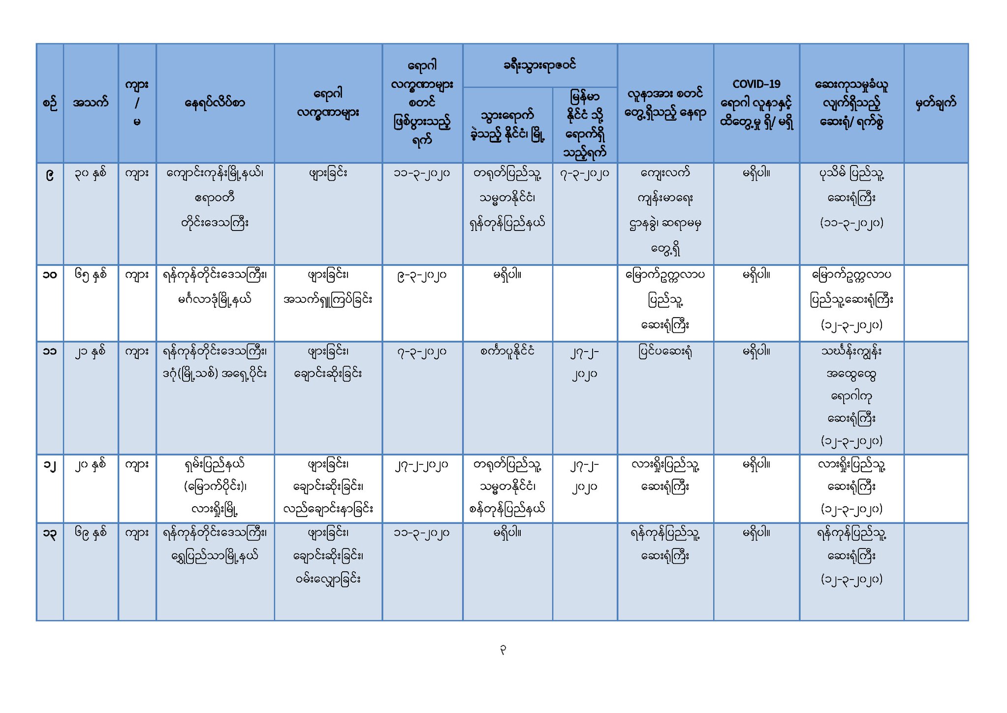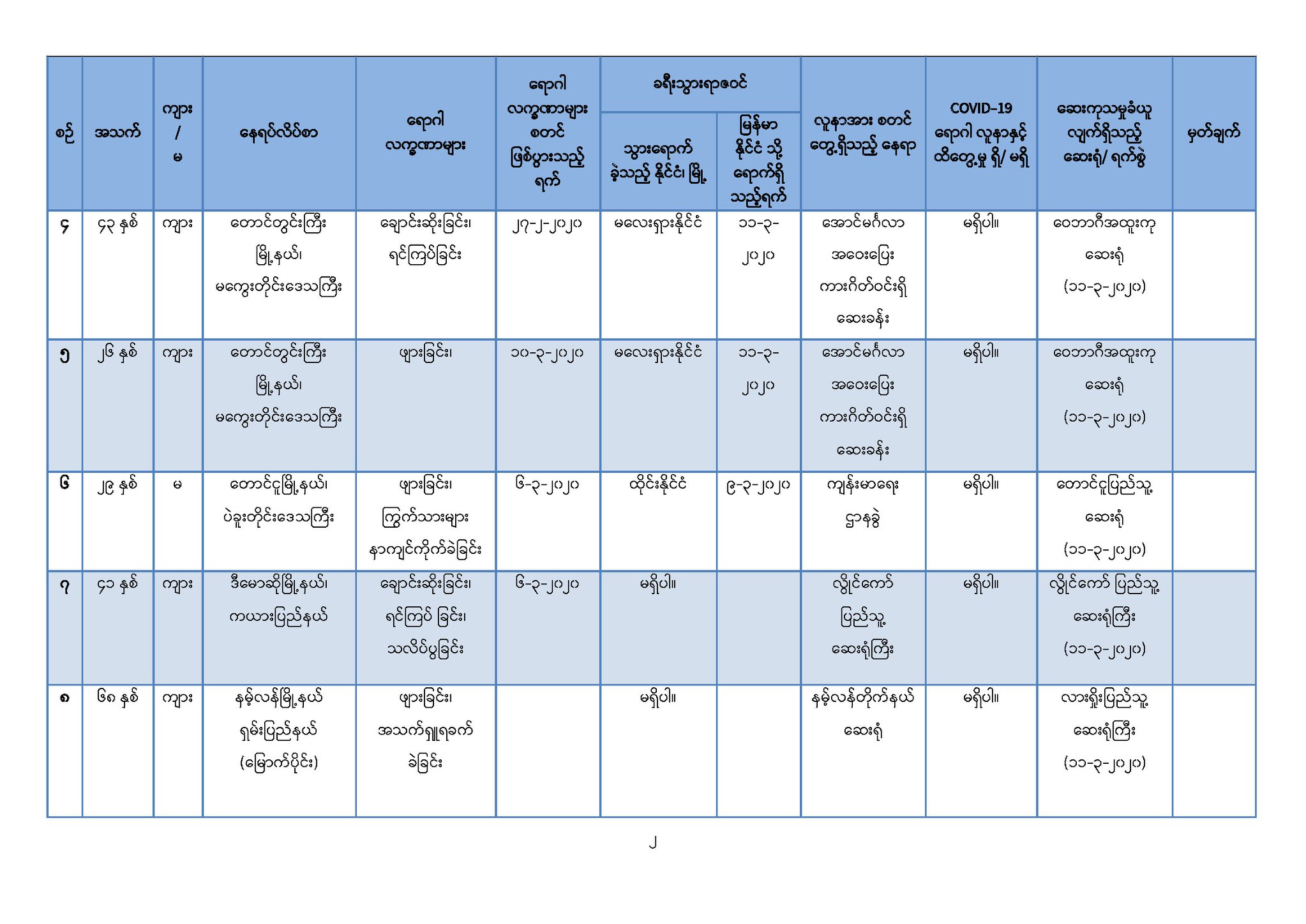 ၄။ ဆေးရုံများတွင်ထားရှိ၍ အသွားအလာကန့်သတ်မှု (Hospital Quarantine) ပြုလုပ်ထား သော တောင်ဥက္ကလာပ အမျိုးသမီးနှင့်ကလေးဆေးရုံကြီးမှ မြန်မာနိုင်ငံသား (၈) ဦးနှင့် မကွေးတိုင်း ဒေသကြီး၊ အောင်လံမြို့နယ်၊ ရွှေပန်းတောတိုက်နယ်ဆေးရုံမှ မြန်မာနိုင်ငံသား (၁) ဦး၊ စုစုပေါင်း (၉) ဦးတို့၏ ဓာတ်ခွဲအဖြေများတွင် Coronavirus Disease 2019 (COVID-19) ဗိုင်းရပ်စ် ရောဂါပိုး မရှိပါကြောင်း (မရှိကြောင်း) စစ်ဆေးသိရှိရပါသည်။
