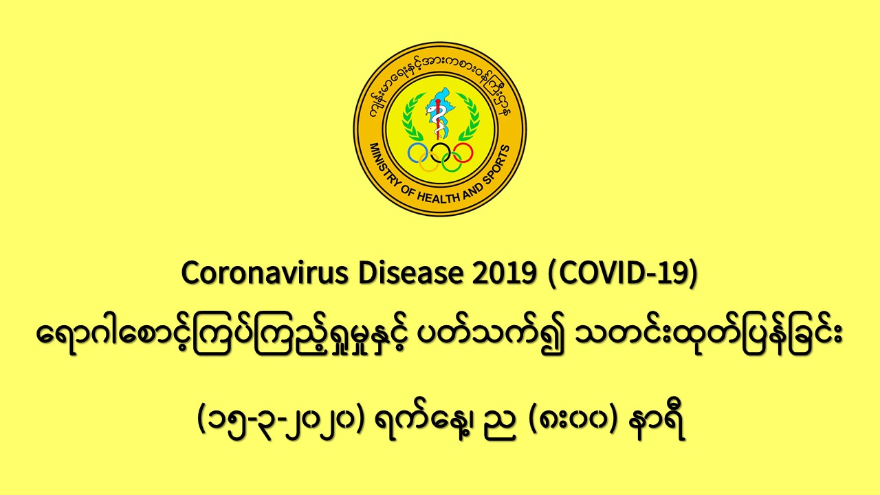 ၁။ ကျန်းမာရေးနှင့် အားကစားဝန်ကြီးဌာနသည် ကမ္ဘာ့နိုင်ငံများတွင် ကူးစက်ပျံ့နှံ့လျက်ရှိသည့် COVID-19 လတ်တလောအသက်ရှူလမ်းကြောင်းဆိုင်ရာ ရောဂါဖြစ်ပွားမှုဖြစ်စဉ်နှင့်ပတ်သက်၍ ရောဂါစောင့်ကြပ်ကြည့်ရှုခြင်း လုပ်ငန်းများအား အပြည်ပြည်ဆိုင်ရာ ဝင်ပေါက်၊ ထွက်ပေါက်ဂိတ် များတွင်လည်းကောင်း၊ ဆေးရုံအခြေပြုအဖြစ်လည်းကောင်း၊ ပြည်သူလူထုအခြေပြု စောင့်ကြပ် ကြည့်ရှုခြင်းလုပ်ငန်းများဖြင့်လည်းကောင်း၊ ပုဂ္ဂလိကဆေးရုံများနှင့် ပူးပေါင်း၍လည်းကောင်း ဆောင်ရွက်လျက်ရှိပါသည်။