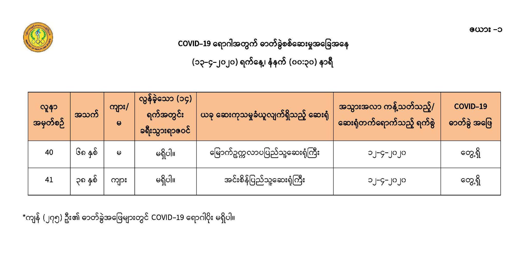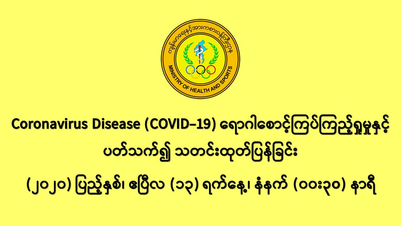 ၁။ အမျိုးသားကျန်းမာရေးဓာတ်ခွဲမှုဆိုင်ရာဌာန (ရန်ကုန်) မှ (၁၂-၄-၂၀၂၀) ရက်နေ့၊ ည ဓာတ်ခွဲစစ်ဆေးမှုများအရ စောင့်ကြည့်လူနာများ၊ ဆေးရုံများနှင့် သက်ဆိုင်ရာနေရာများတွင် အသွားအလာကန့်သတ်၍ စောင့်ကြပ်ကြည့်ရှုမှုခံနေသူများ စုစုပေါင်း (၂၇၈)ဦး၏ ဓာတ်ခွဲ နမူနာများအား စစ်ဆေးခဲ့ရာ ဇယား (၁) ၌ ဖော်ပြထားရှိသော လူနာ (၂) ဦးနှင့် (၁၂-၄-၂၀၂၀) ရက်နေ့၊ ည (၈:၀၀) နာရီသတင်းတွင် ဖော်ပြထားရှိသော လူနာ (၁) ဦး၊ စုစုပေါင်း (၃) ဦး၏ ဓာတ်ခွဲအဖြေတွင် COVID-19 ရောဂါပိုး တွေ့ရှိ (တွေ့ရှိ) ရပြီး ကျန်လူနာများနှင့် စောင့်ကြပ် ကြည့်ရှုမှုခံနေသူ (၂၇၅) ဦး၏ ဓာတ်ခွဲအဖြေများတွင် COVID-19 ရောဂါပိုး မရှိကြောင်း တွေ့ရှိ ရပါသည်။