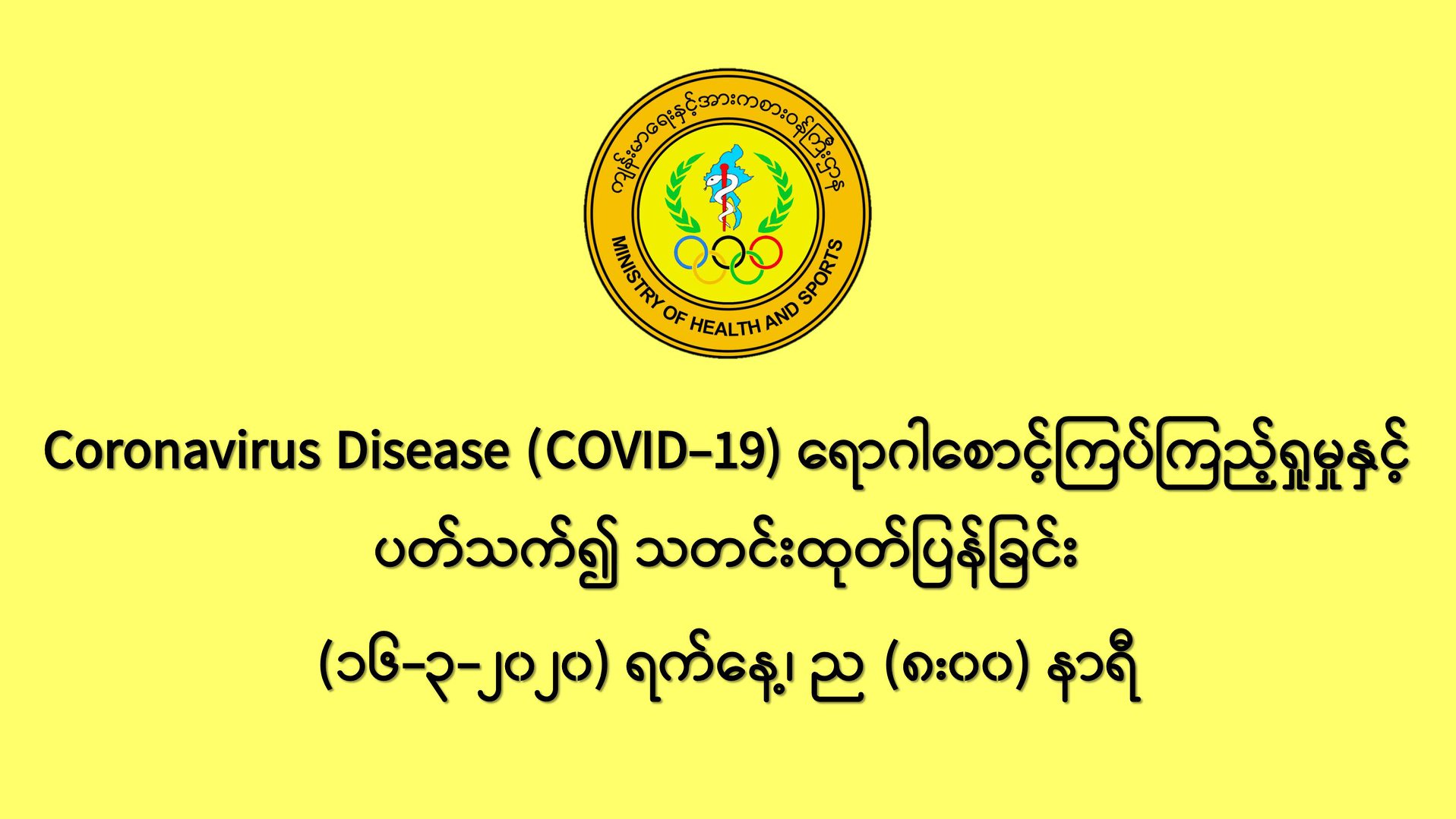 ၆။ (၁၆-၃-၂၀၂၀) ရက်နေ့အထိ မြန်မာနိုင်ငံတွင် COVID-19 ရောဂါ ဓာတ်ခွဲအတည်ပြုလူနာ မတွေ့ရှိသေးသော်လည်း ရောဂါစောင့်ကြပ်ကြည့်ရှုခြင်းလုပ်ငန်းများကို အရှိန်အဟုန်မြှင့်၍ ဆောင် ရွက်လျက်ရှိပါသည်။ ယခုအခါ တရုတ်ပြည်သူ့သမ္မတနိုင်ငံနှင့် အိမ်နီးချင်းနိုင်ငံအချို့ အပါအဝင် ကမ္ဘာ့နိုင်ငံ (၁၄၃) နိုင်ငံတွင် COVID-19 ရောဂါ ကူးစက်ဖြစ်ပွားလျက်ရှိသဖြင့် ပြည်သူလူထုအနေ ဖြင့် ကျန်းမာရေးနှင့်အားကစားဝန်ကြီးဌာနမှ ထုတ်ပြန်ထားသော ရောဂါကာကွယ်ရေးဆိုင်ရာ ကျန်းမာရေး အသိပညာပေးအချက်အလက်များအား တိကျစွာလိုက်နာဆောင်ရွက်ရန် နှိုးဆော်အပ် ပါသည်။