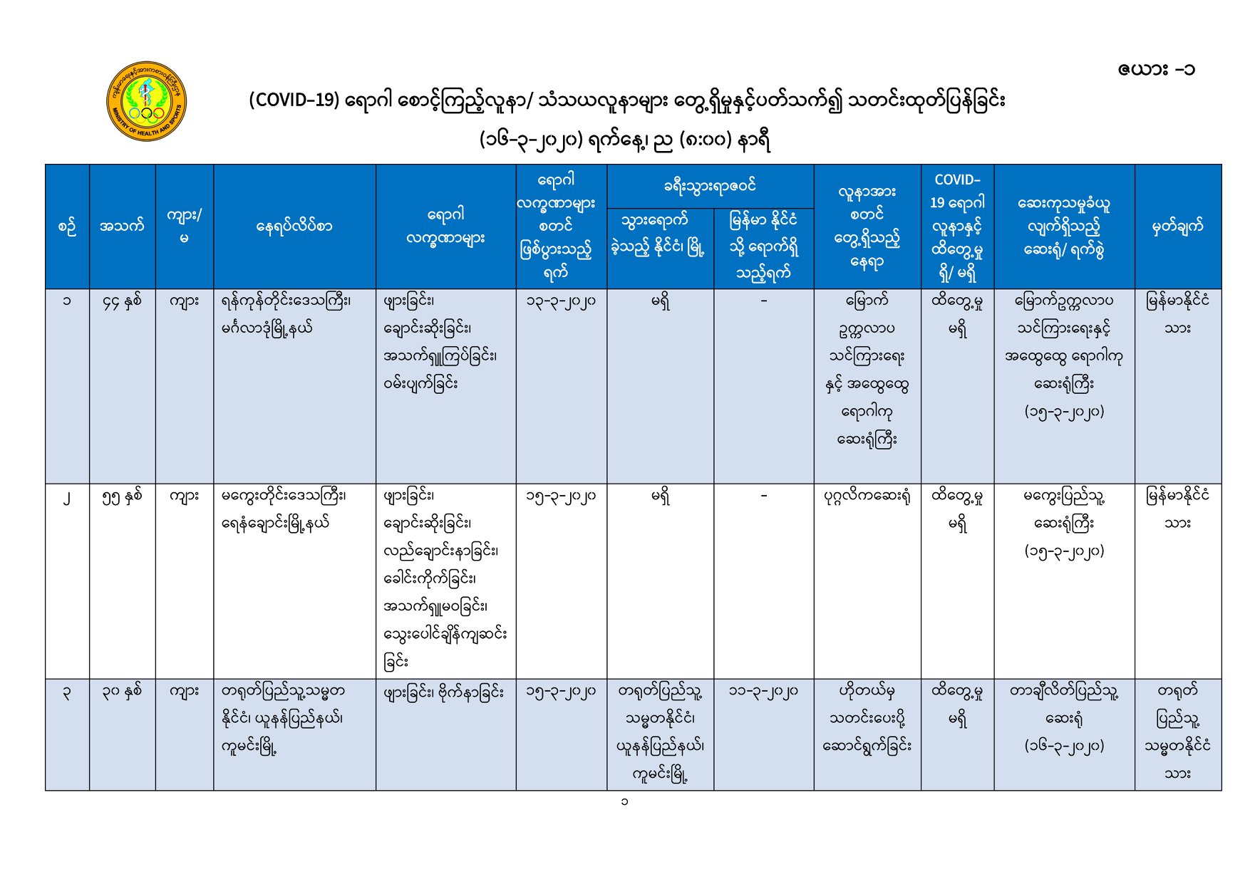 ၃။ (၁၆-၃-၂၀၂၀) ရက်နေ့တွင် ဂျာမနီနိုင်ငံမှ မြန်မာနိုင်ငံ၊ ရန်ကုန်အပြည်ပြည်ဆိုင်ရာလေဆိပ် သို့ ပြန်လည်ရောက်ရှိလာသည့် မြန်မာနိုင်ငံသား (၂) ဦးနှင့် ထိုင်းနိုင်ငံမှ ပြန်လည်ရောက်ရှိလာသည့် မြန်မာနိုင်ငံသား (၁) ဦး၊ စုစုပေါင်း (၃) ဦးတို့တွင် ဖျားခြင်းနှင့် အခြားအသက်ရှူလမ်းကြောင်း ဆိုင်ရာ ရောဂါလက္ခဏာများ၊ COVID-19 ဓာတ်ခွဲအတည်ပြုလူနာနှင့် အနီးကပ်ထိတွေ့ခဲ့မှုများမရှိ သော်လည်း ရောဂါဖြစ်ပွားမှု မြင့်မားလျက်ရှိသော နိုင်ငံများသို့သွားရောက်ခဲ့သည့် ရာဇဝင်ရှိသဖြင့် ၎င်းတို့အား ဆေးရုံတွင် (၁၄) ရက်ခွဲခြားထားရှိ၍ အသွားအလာကန့်သတ်ခြင်း (Hospital Quarantine) ပြုလုပ်၍ စောင့်ကြပ် ကြည့်ရှုလျက်ရှိပါသည်။