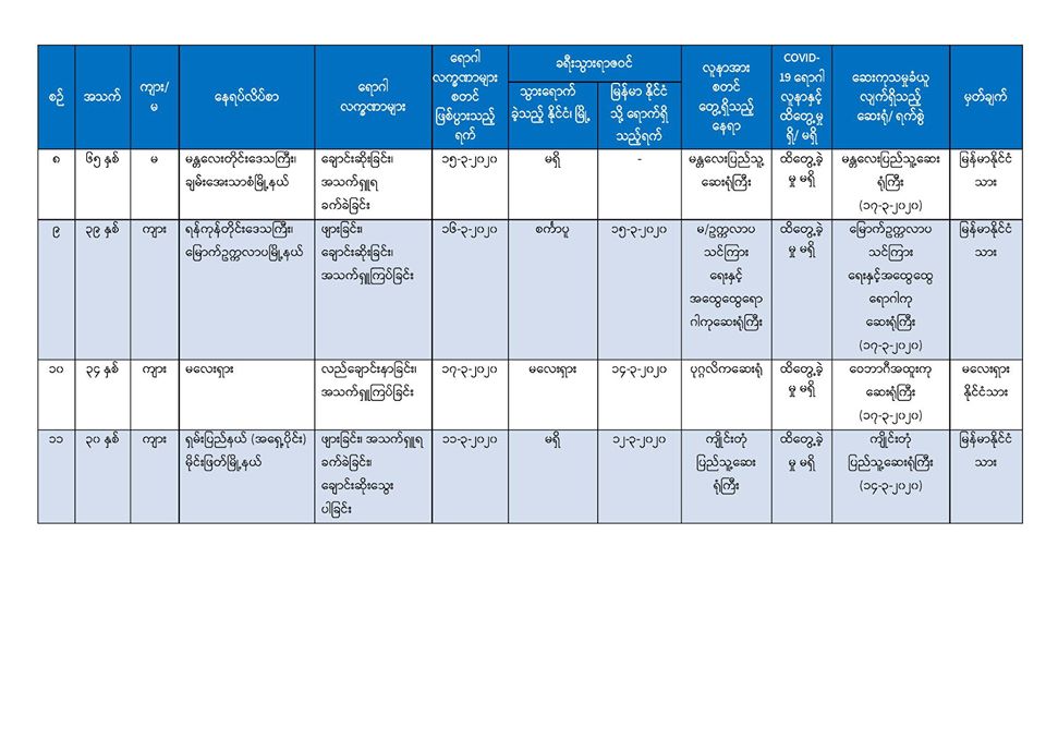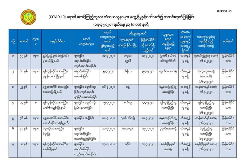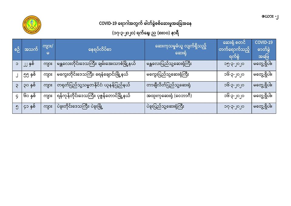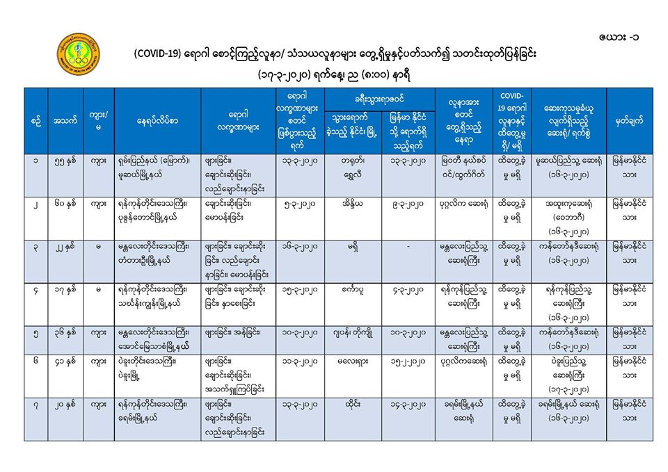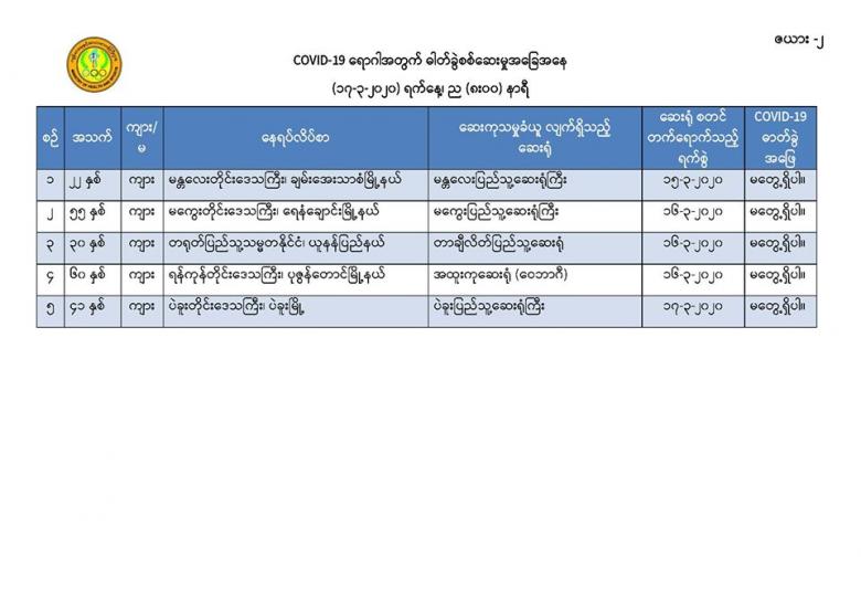 ၅။ မန္တလေးတိုင်းဒေသကြီး၊ တံတားဦးမြို့နယ်တွင် နေထိုင်သော အသက် (၂၅) နှစ်အရွယ် အမျိုးသမီးတစ်ဦးသည် လည်ချောင်းနာခြင်း၊ အန်ခြင်း၊ အစာမစားနိုင်ခြင်း စသည့် လက္ခဏာများဖြင့် တောင်ပြုံးတိုက်နယ်ဆေးရုံတွင် (၁၄-၃-၂၀၂၀) ရက်နေ့၊ နံနက် (၉း၀၀) နာရီအချိန်တွင် တက်ရောက်ကုသခဲ့ပြီး လူနာမှာ သက်သာမှု မရှိသဖြင့် မန္တလေးအထွေထွေရောဂါကုဆေးရုံကြီးသို့ လွှဲပြောင်းညွှန်းပို့ခဲ့ရာ လူနာတွင် မောခြင်း၊ အသက်ရှူကြပ်ခြင်း စသည့်လက္ခဏာများ တွေ့ရှိရ သဖြင့် စောင့်ကြည့်လူနာအဖြစ်သတ်မှတ်၍ (၁၇-၃-၂၀၂၀) ရက်နေ့၊ နံနက် (၂း၀၀) နာရီအချိန်တွင် ကန်တော်နဒီဆေးရုံသို့ ထပ်မံညွှန်းပို့ခဲ့ပါသည်။ အဆိုပါလူနာထံမှ ဓာတ်ခွဲနမူနာရယူ၍ အမျိုးသား ကျန်းမာရေးဓာတ်ခွဲမှုဆိုင်ရာဌာန (ရန်ကုန်) သို့ ပေးပို့ထားရှိပြီး လိုအပ်သော ဆေးကုသမှုများ ဆောင်ရွက်စဉ် နံနက် (၇း၃၀) နာရီအချိန်တွင် သေဆုံးသွားခဲ့ကြောင်း သိရှိရပါသည်။ သေဆုံးရသည့် အကြောင်းအရင်းမှာ လူနာ၏ ရောဂါရာဇဝင်နှင့် သွေးစစ်ချက်အဖြေများအရ သွေးဆိပ်တက်ခြင်း၏ နောက်ဆက်တွဲဆိုးကျိုးများကြောင့် ဖြစ်နိုင်ကြောင်း သိရှိရပါသည်။ အဆိုပါ လူနာ၏ ဓာတ်ခွဲနမူနာ အဖြေရရှိလျှင် အချိန်နှင့်တစ်ပြေးညီ ထပ်မံထုတ်ပြန်သွားမည် ဖြစ်ပါသည်။