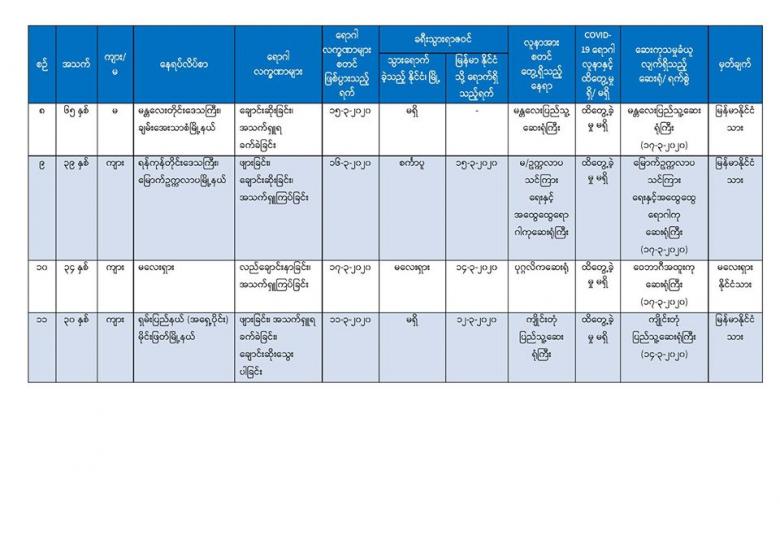 ၃။ (၁၇-၃-၂၀၂၀) ရက်နေ့တွင် ဂျာမနီနိုင်ငံမှ မြန်မာနိုင်ငံ၊ ရန်ကုန်အပြည်ပြည်ဆိုင်ရာလေဆိပ် သို့ ပြန်လည်ရောက်ရှိလာသည့် မြန်မာနိုင်ငံသား (၂) ဦးနှင့် ထိုင်းနိုင်ငံမှ ပြန်လည်ရောက်ရှိလာသည့် မြန်မာနိုင်ငံသား (၁) ဦး၊ စုစုပေါင်း (၃) ဦးတို့တွင် ဖျားခြင်းနှင့် အခြားအသက်ရှူလမ်းကြောင်း ဆိုင်ရာ ရောဂါလက္ခဏာများ၊ COVID-19 ဓာတ်ခွဲအတည်ပြုလူနာနှင့် အနီးကပ်ထိတွေ့ခဲ့မှုများမရှိ သော်လည်း ရောဂါဖြစ်ပွားမှု မြင့်မားလျက်ရှိသော နိုင်ငံများသို့သွားရောက်ခဲ့သည့် ရာဇဝင်ရှိသဖြင့် ၎င်းတို့အား ဆေးရုံတွင် (၁၄) ရက်ခွဲခြားထားရှိပြီး အသွားအလာကန့်သတ်ခြင်း (Hospital Quarantine) ပြုလုပ်၍ စောင့်ကြပ်ကြည့်ရှုလျက်ရှိပါသည်။