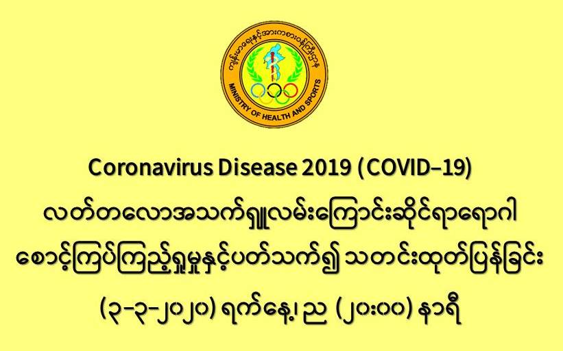 ၆။ (၃-၃-၂၀၂၀) ရက်နေ့အထိ မြန်မာနိုင်ငံတွင် COVID-19 ရောဂါ ဓာတ်ခွဲအတည်ပြုလူနာ မတွေ့ရှိသေးသော်လည်း ရောဂါစောင့်ကြပ်ကြည့်ရှုခြင်းလုပ်ငန်းများကို အရှိန်အဟုန်မြှင့်၍ ဆောင်ရွက် လျက်ရှိပါသည်။ ယခုအခါ တရုတ်ပြည်သူ့သမ္မတနိုင်ငံနှင့် အိမ်နီးချင်းနိုင်ငံအချို့ အပါအဝင် ကမ္ဘာ့နိုင်ငံ (၆၄) နိုင်ငံတွင် COVID-19 ရောဂါ ကူးစက်ဖြစ်ပွားလျက်ရှိသဖြင့် ပြည်သူလူထုအနေဖြင့် ကျန်းမာရေးနှင့်အားကစားဝန်ကြီးဌာနမှ ထုတ်ပြန်ထားသော ရောဂါကာကွယ်ရေးဆိုင်ရာ ကျန်းမာရေးအသိပညာ ပေးအချက်အလက်များအား တိကျစွာလိုက်နာဆောင်ရွက်ရန် ထပ်မံတိုက်တွန်းနှိုးဆော်အပ်ပါသည်။