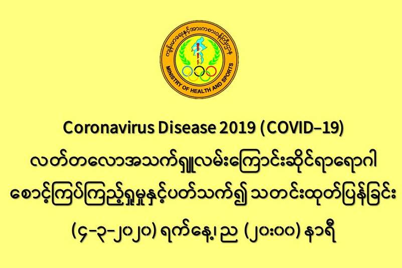 ၅။ (၄-၃-၂၀၂၀) ရက်နေ့အထိ မြန်မာနိုင်ငံတွင် COVID-19 ရောဂါ ဓာတ်ခွဲအတည်ပြုလူနာ မတွေ့ရှိသေးသော်လည်း ရောဂါစောင့်ကြပ်ကြည့်ရှုခြင်းလုပ်ငန်းများကို အရှိန်အဟုန်မြှင့်၍ဆောင် ရွက်လျက်ရှိပါသည်။ ယခုအခါ တရုတ်ပြည်သူ့သမ္မတနိုင်ငံနှင့် အိမ်နီးချင်းနိုင်ငံအချို့ အပါအဝင် ကမ္ဘာ့နိုင်ငံ (၇၃) နိုင်ငံတွင် COVID-19 ရောဂါ ကူးစက်ဖြစ်ပွားလျက်ရှိသဖြင့် ပြည်သူလူထုအနေဖြင့် ကျန်းမာရေးနှင့်အားကစားဝန်ကြီးဌာနမှထုတ်ပြန်ထားသော ရောဂါကာကွယ်ရေးဆိုင်ရာ ကျန်းမာရေး အသိပညာပေးအချက်အလက်များအား တိကျစွာလိုက်နာဆောင်ရွက်ရန် နှိုးဆော်အပ်ပါသည်။ COVID-19 ရောဂါ ဖြစ်ပွားသူနှင့် ထိတွေ့ခဲ့သူများ၊ ရောဂါကူးစက်ပြန့်ပွားမှုများပြားရာ နေရာဒေသမှ ပြည်တွင်းသို့ရောက်ရှိခဲ့သူများနှင့် သံသယရောဂါလက္ခဏာဖြစ်ပွားလာသူများ အနေဖြင့် အနီးဆုံးကျန်းမာရေး ဌာနသို့ မဖြစ်မနေသတင်းပေးပို့ကြပါရန်၊ သံသယရောဂါလက္ခဏာဖြစ်ပွားသူများကို တွေ့ရှိပါက ပြည်သူများအနေဖြင့်လည်း အနီးဆုံးကျန်းမာရေးဌာနထံသို့ သတင်းပေးပို့ပါရန် နှင့် ကျန်းမာရေးနှင့်အားကစားဝန်ကြီးဌာနမှ အသွားအလာကန့်သတ်၍ ရောဂါစောင့်ကြပ်ကြည့်ရှုခြင်း (quarantine) လုပ်ငန်းဆောင်ရွက်မှုများတွင် ပါဝင်ကြပါရန် ထပ်မံတိုက်တွန်းနှိုးဆော်အပ်ပါသည်။