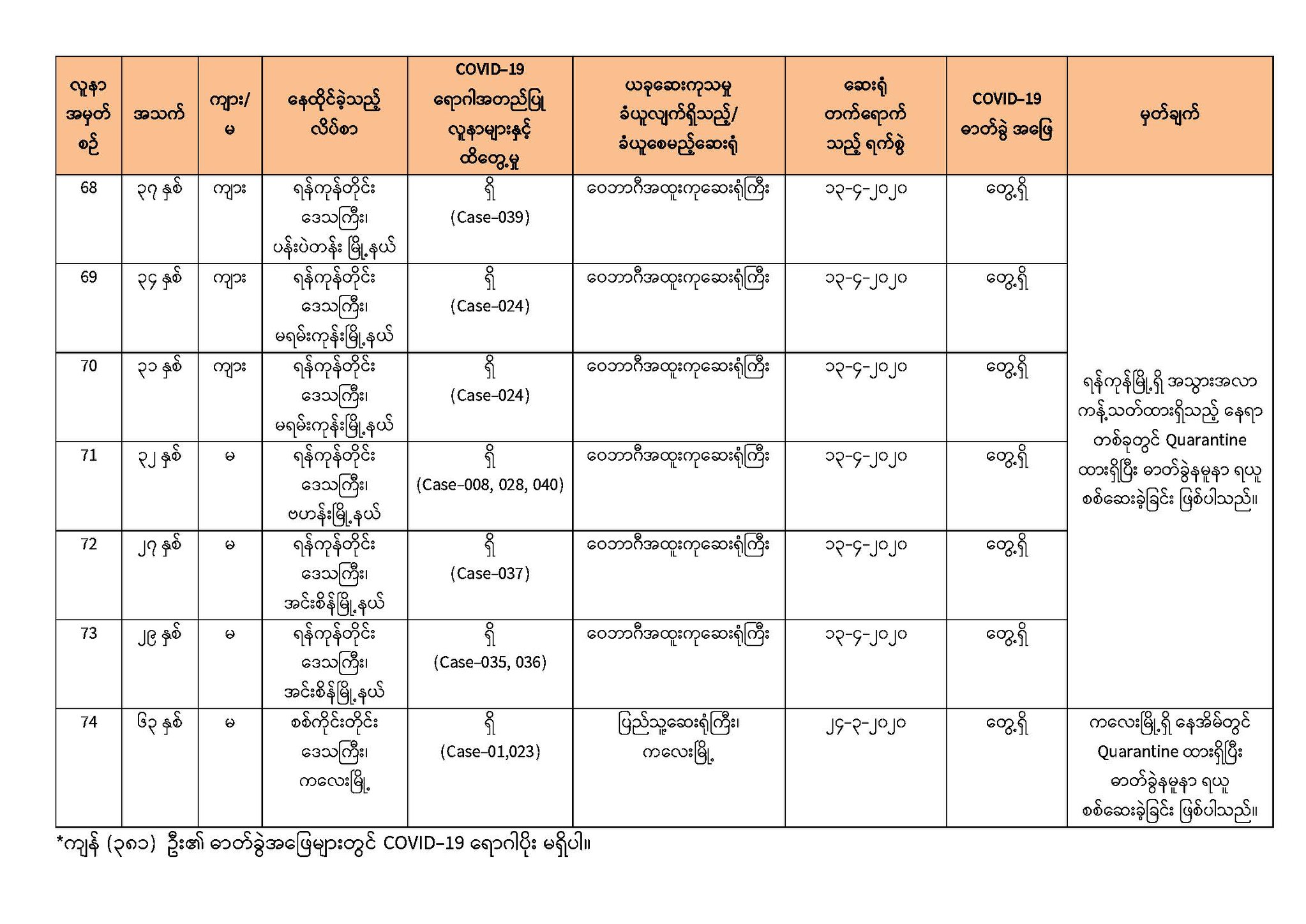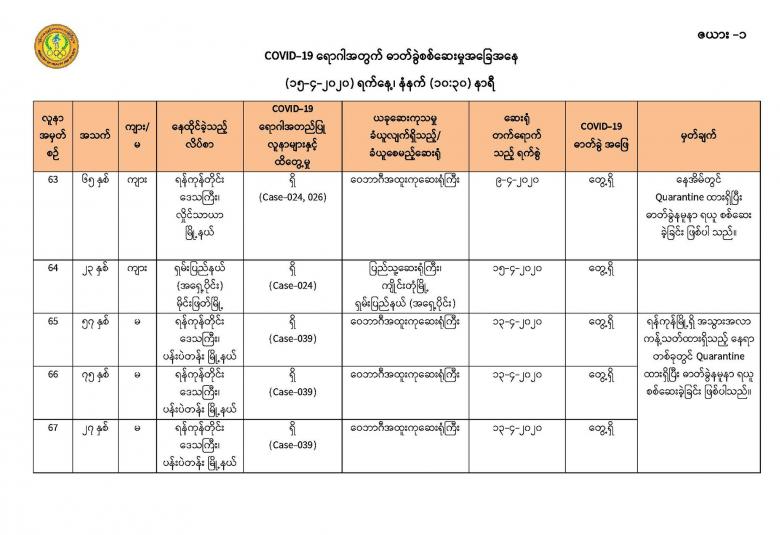 ၂။ ဓာတ်ခွဲအတည်ပြုလူနာ (Case-063)၏ သတင်းကို (၁၄-၄-၂၀၂၀) ရက်နေ့၊ ည (၈:၀၀) နာရီသတင်းတွင် ထုတ်ပြန်ပြီးဖြစ်ပါသည်။