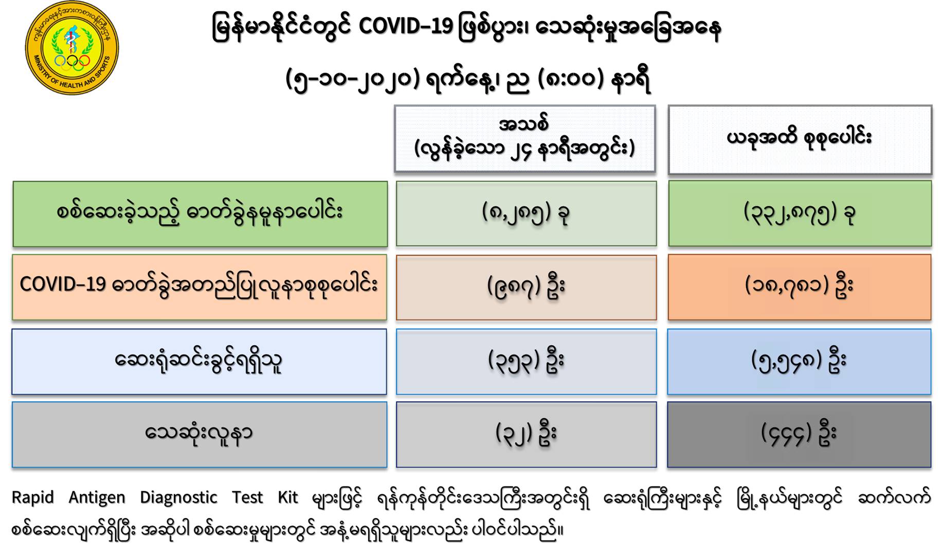 (၄-၁၀-၂၀၂၀) ရက်နေ့၊ ည (၈:၀၀)နာရီမှ (၅-၁၀-၂၀၂၀) ရက်နေ့၊ ည (၈:၀၀) နာရီ အတွင်း ဓာတ်ခွဲနမူနာ စုစုပေါင်း (၈,၂၈၅) ခုအား စစ်ဆေးပြီးစီးခဲ့ရာ COVID-19 ရောဂါ ဓာတ်ခွဲ အတည်ပြုလူနာသစ် (၉၈၇)ဦး တွေ့ရှိရပါသည်။