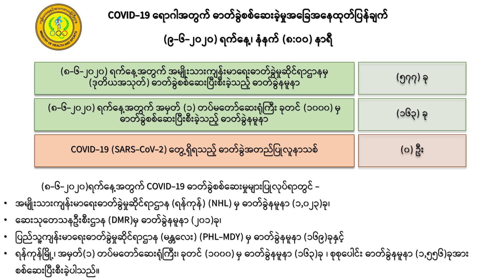 ၁။ (၈-၆-၂၀၂၀)ရက်နေ့အတွက် COVID-19 ဓာတ်ခွဲစစ်ဆေးမှုများ ပြုလုပ်ရာတွင်