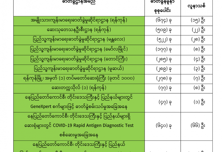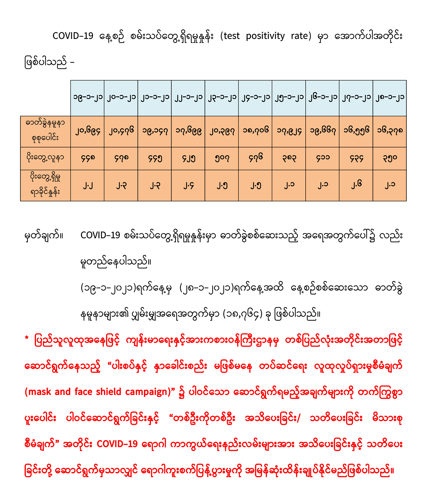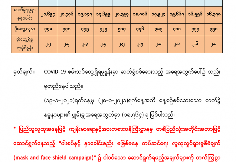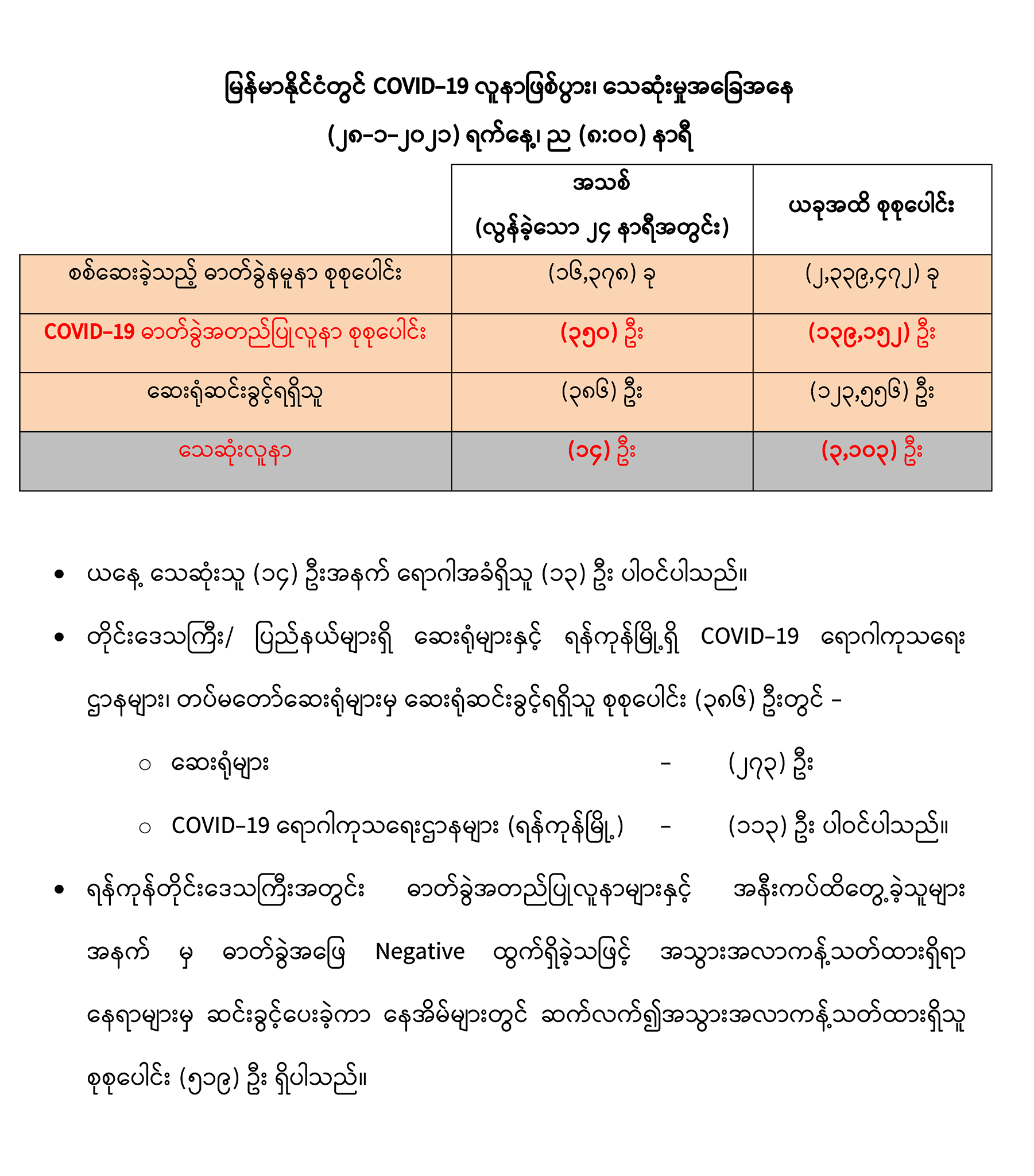 (၂၇-၁-၂၀၂၁)ရက်နေ့၊ ည (၈:၀၀)နာရီမှ (၂၈-၁-၂၀၂၁)ရက်နေ့၊ ည (၈:၀၀)နာရီအတွင်း ဓာတ်ခွဲ နမူနာ စုစုပေါင်း (၁၆,၃၇၈)ခုအားစစ်ဆေးပြီးစီးခဲ့ရာ COVID-19 ရောဂါ ဓာတ်ခွဲအတည်ပြု လူနာသစ် ၃၅၀ တွေ့ရှိရပါသည်။