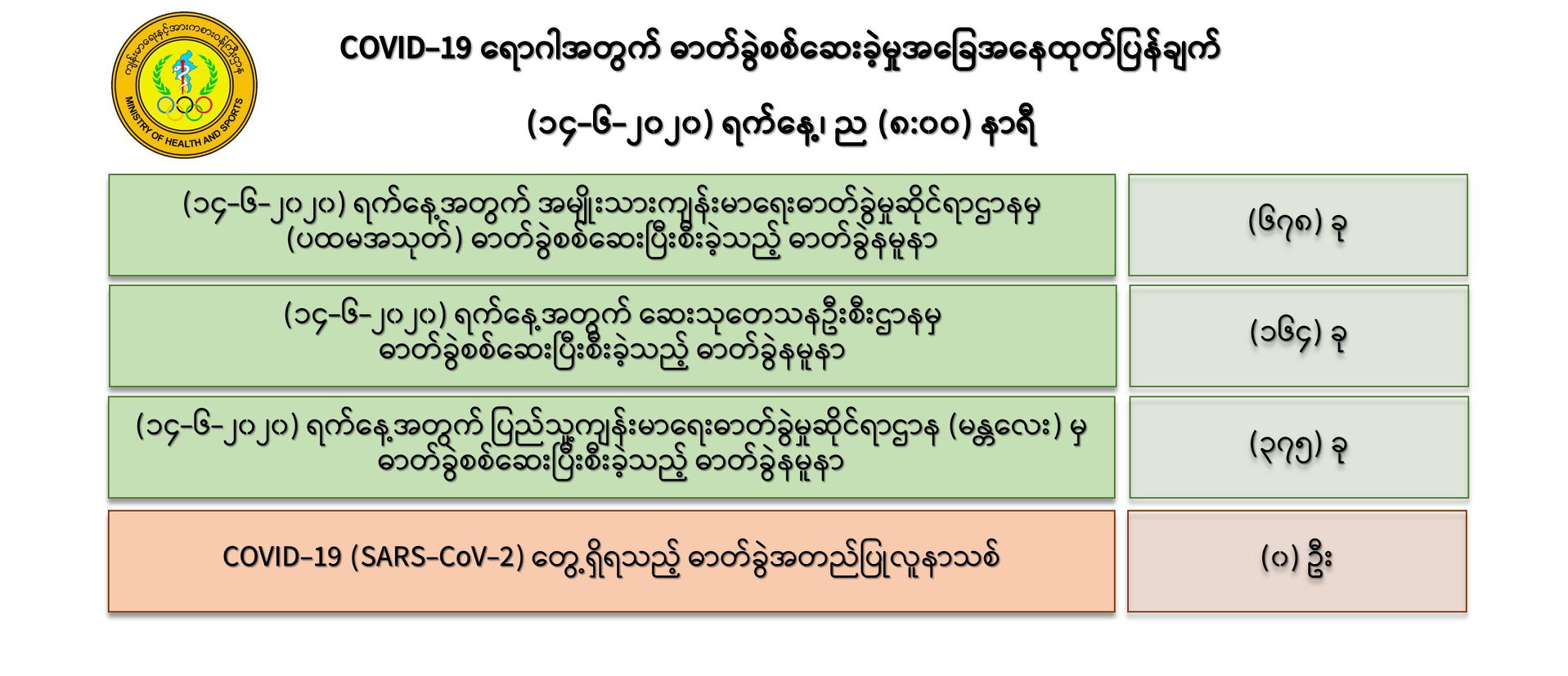 - အမျိုးသားကျန်းမာရေးဓာတ်ခွဲမှုဆိုင်ရာဌာန (ရန်ကုန်) (NHL) မှ (ပထမအသုတ်) ဓာတ်ခွဲ နမူနာ (၆၇၈)ခု၊