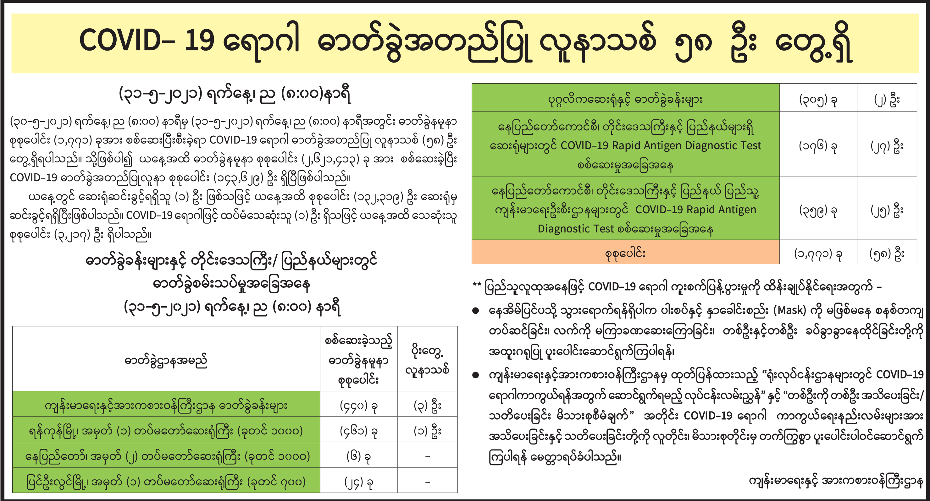 COVID-19 ရောဂါ ဓာတ်ခွဲအတည်ပြုလူနာသစ် ၅၈ ဦးတွေ့ရှိ