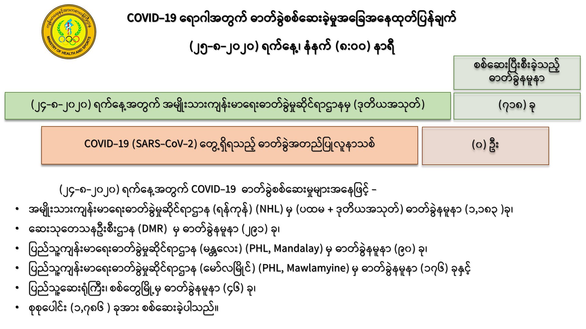 ၁။ (၂၄-၈-၂၀၂၀) ရက်နေ့အတွက် COVID-19 ရောဂါ ဓာတ်ခွဲစစ်ဆေးရာတွင် -