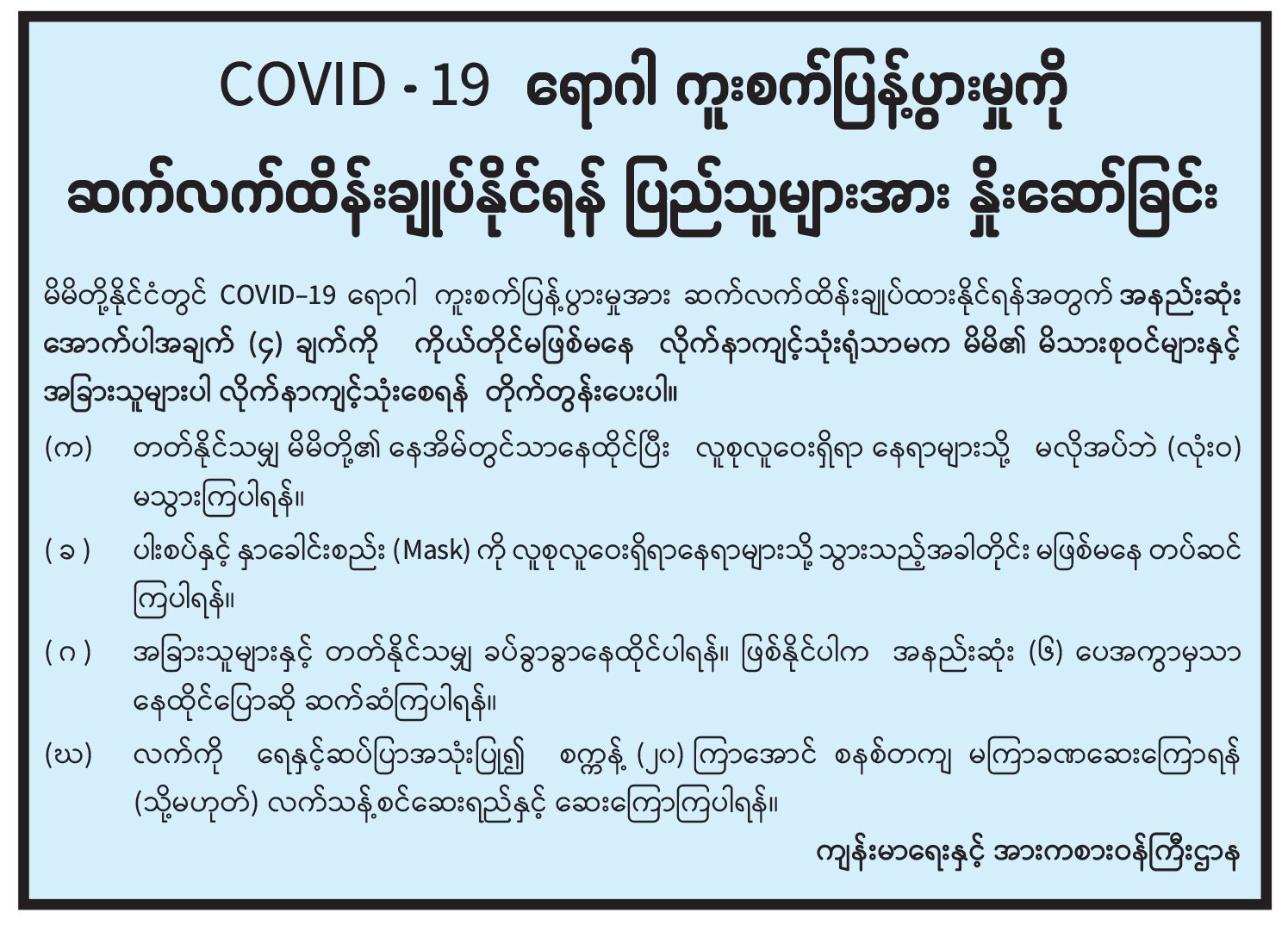 COVID -19 ရောဂါ ကူးစက်ပြန့်ပွားမှုကို ဆက်လက်ထိန်းချုပ်နိုင်ရန် ပြည်သူများအား နှိုးဆော်ခြင်း