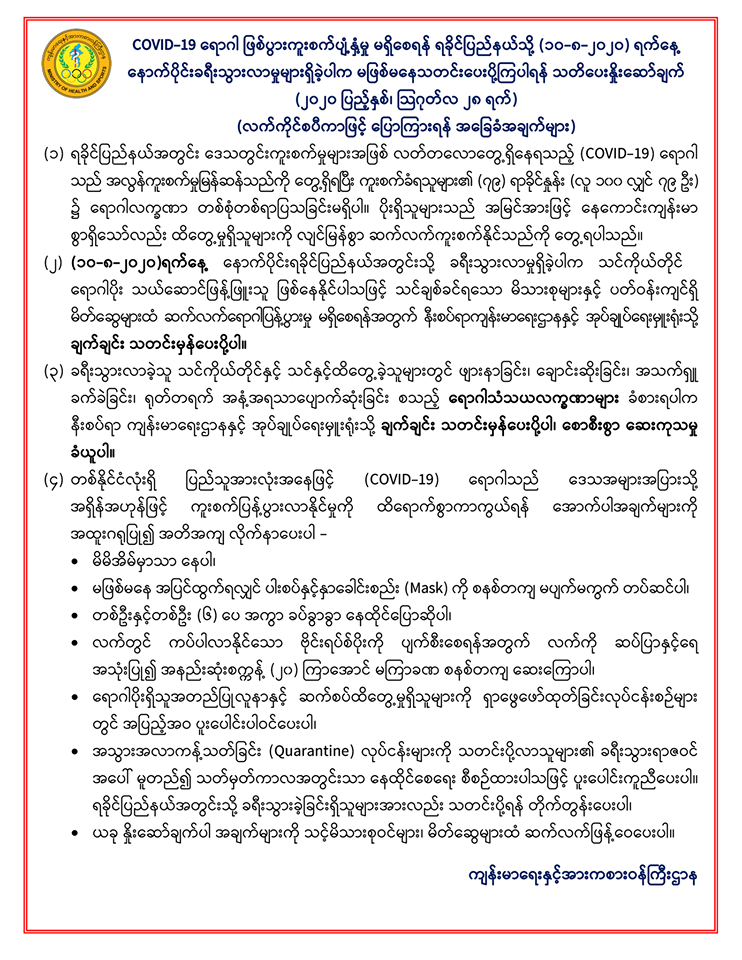(၄) တစ်နိုင်ငံလုံးရှိ ပြည်သူအားလုံးအနေဖြင့် (COVID-19) ရောဂါသည် ဒေသအများအပြားသို့ အရှိန်အဟုန်ဖြင့် ကူးစက်ပြန့်ပွားလာနိုင်မှုကို ထိရောက်စွာကာကွယ်ရန် အောက်ပါအချက်များကို အထူးဂရုပြု၍ အတိအကျ လိုက်နာပေးပါ -