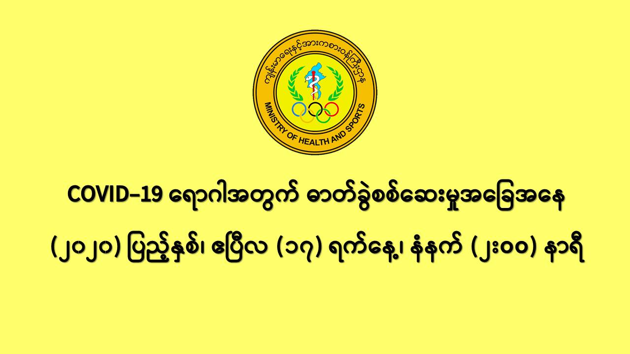 ၁။ အမျိုးသားကျန်းမာရေးဓာတ်ခွဲမှုဆိုင်ရာဌာန (ရန်ကုန်) သည် (၁၆-၄-၂၀၂၀) ရက်နေ့တွင် ရောဂါစောင့်ကြည့်လူနာ (၁၁၀) ဦး နှင့် အသွားအလာ ကန့်သတ်ခြင်း/ တားမြစ်ခြင်း ဆောင်ရွက်ထားရှိသူ (၁၅၉) ဦး၊ စုစုပေါင်း (၂၆၉) ဦး၏ ဓာတ်ခွဲနမူနာများအား စစ်ဆေးခဲ့ရာ ဓာတ်ခွဲနမူနာအားလုံးတွင် COVID-19 ရောဂါပိုးမတွေ့ရှိပါ။