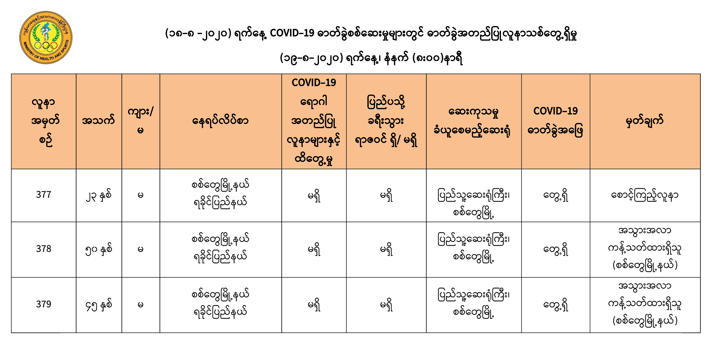၂။ (၁၉-၈-၂၀၂၀)ရက်နေ့၊ နံနက် (၈:၀၀) နာရီအထိ မြန်မာနိုင်ငံတွင် COVID-19 ရောဂါဓာတ်ခွဲအတည်ပြုလူနာ (၃၇၉)ဦး ရှိပါသည်။