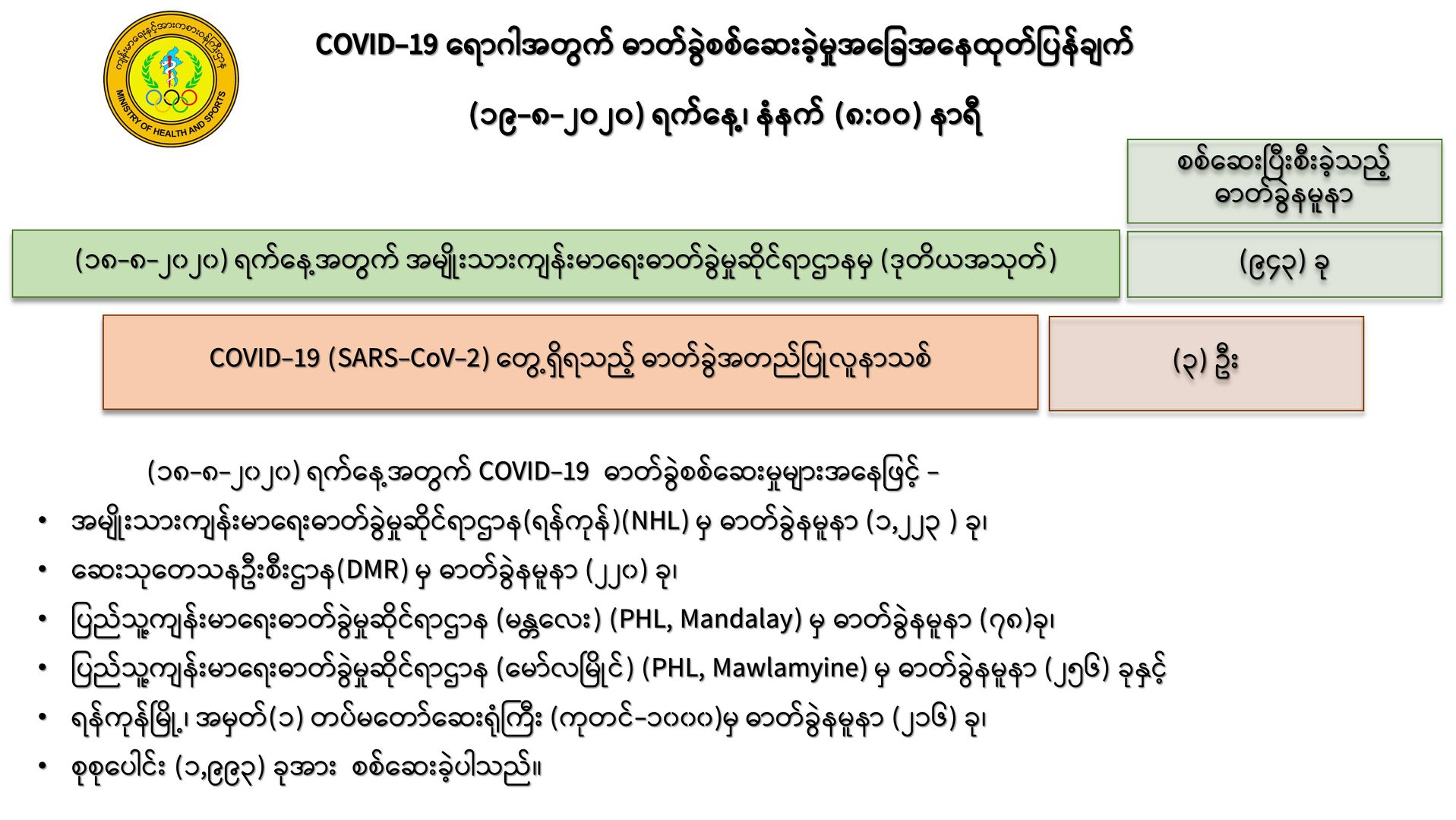 ၁။ (၁၈-၈-၂၀၂၀) ရက်နေ့အတွက် COVID-19 ရောဂါ ဓာတ်ခွဲစစ်ဆေးရာတွင် -