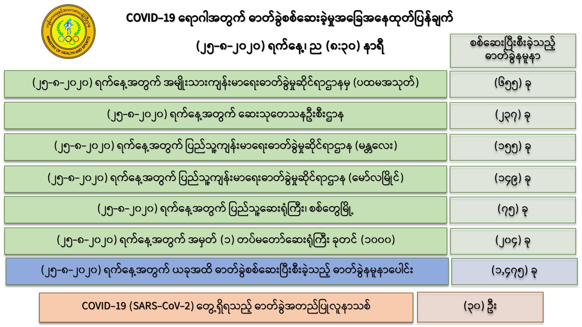 ၁။ (၂၅-၈-၂၀၂၀) ရက်နေ့အတွက် COVID-19 ရောဂါ ဓာတ်ခွဲစစ်ဆေးရာတွင် -