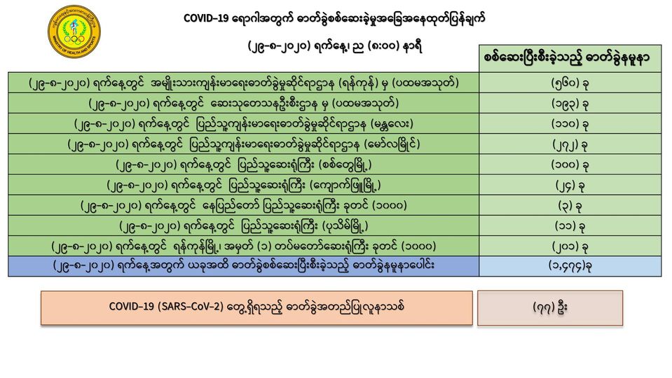 ၁။ (၂၉-၈-၂၀၂၀) ရက်နေ့အတွက် COVID-19 ရောဂါ ဓာတ်ခွဲစစ်ဆေးရာတွင် -