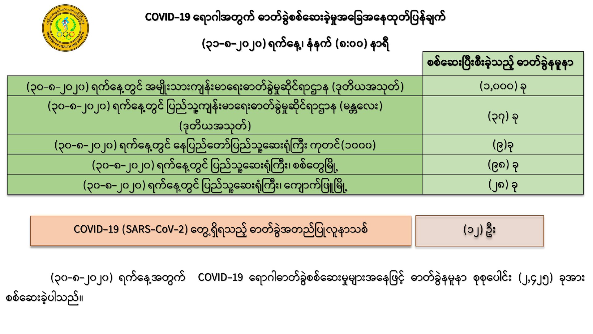 ၃။ (၃၀-၈-၂၀၂၀) ရက်နေ့အတွက် COVID-19 ရောဂါ ဓာတ်ခွဲစစ်ဆေးမှုများအနေဖြင့် အမျိုးသားကျန်းမာရေး ဓာတ်ခွဲမှုဆိုင်ရာဌာန(ရန်ကုန်)(NHL) မှ ဓာတ်ခွဲနမူနာ (၁,၅၇၀) ခု၊ ဆေးသုတေသနဦးစီးဌာန(DMR) မှ ဓာတ်ခွဲနမူနာ (၄၁၉) ခု၊ ပြည်သူ့ကျန်းမာရေးဓာတ်ခွဲမှုဆိုင်ရာဌာန(မန္တလေး) မှ ဓာတ်ခွဲနမူနာ (၃၀၁) ခု၊ နေပြည်တော် ပြည်သူ့ဆေးရုံကြီး ကုတင်(၁၀၀၀) မှ ဓာတ်ခွဲနမူနာ (၉)ခု ပြည်သူ့ဆေးရုံကြီး၊ စစ်တွေမြို့မှ ဓာတ်ခွဲနမူနာ (၉၈) ခုနှင့် ပြည်သူ့ဆေးရုံကြီး၊ ကျောက်ဖြူမြို့မှ ဓာတ်ခွဲနမူနာ (၂၈)ခု၊ စုစုပေါင်း(၂,၄၂၅) ခုအား စစ်ဆေးခဲ့ပါသည်။